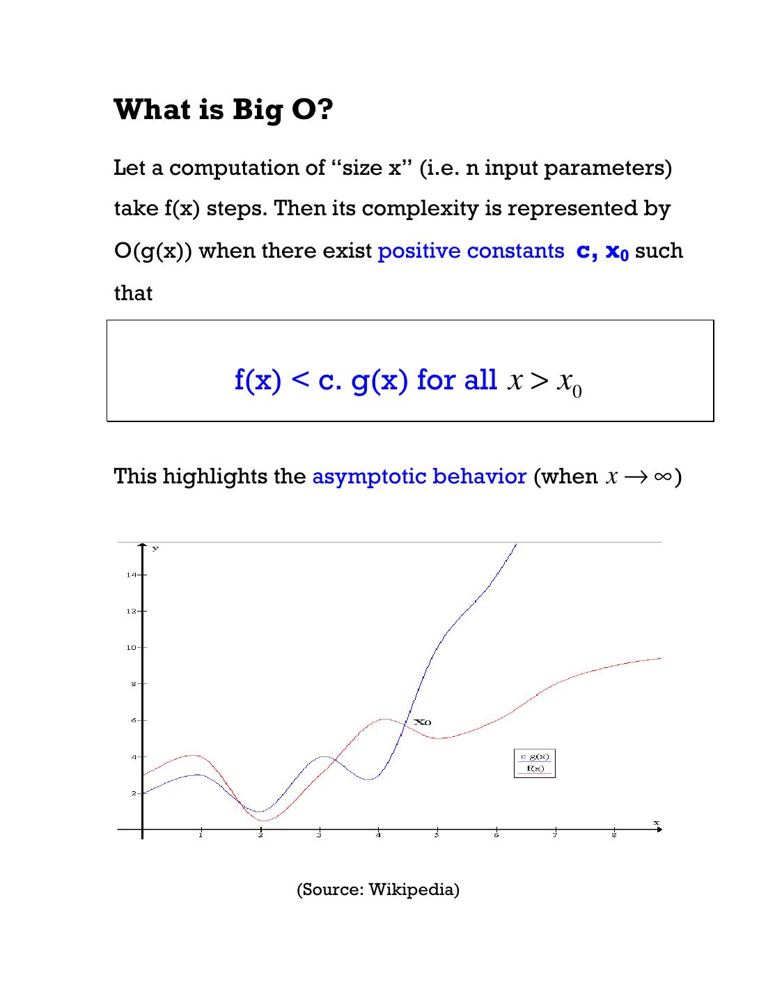 2 .What is Big O? Let a computation of “size x” (i.e. n input parameters) take f(x) steps. Then its complexity is represented by O(g(x)) when there exist positive constants c, x0 such that f(x) < c. g(x) for all x > x0 This highlights the asymptotic behavior (when x → ∞ ) (Source: Wikipedia)