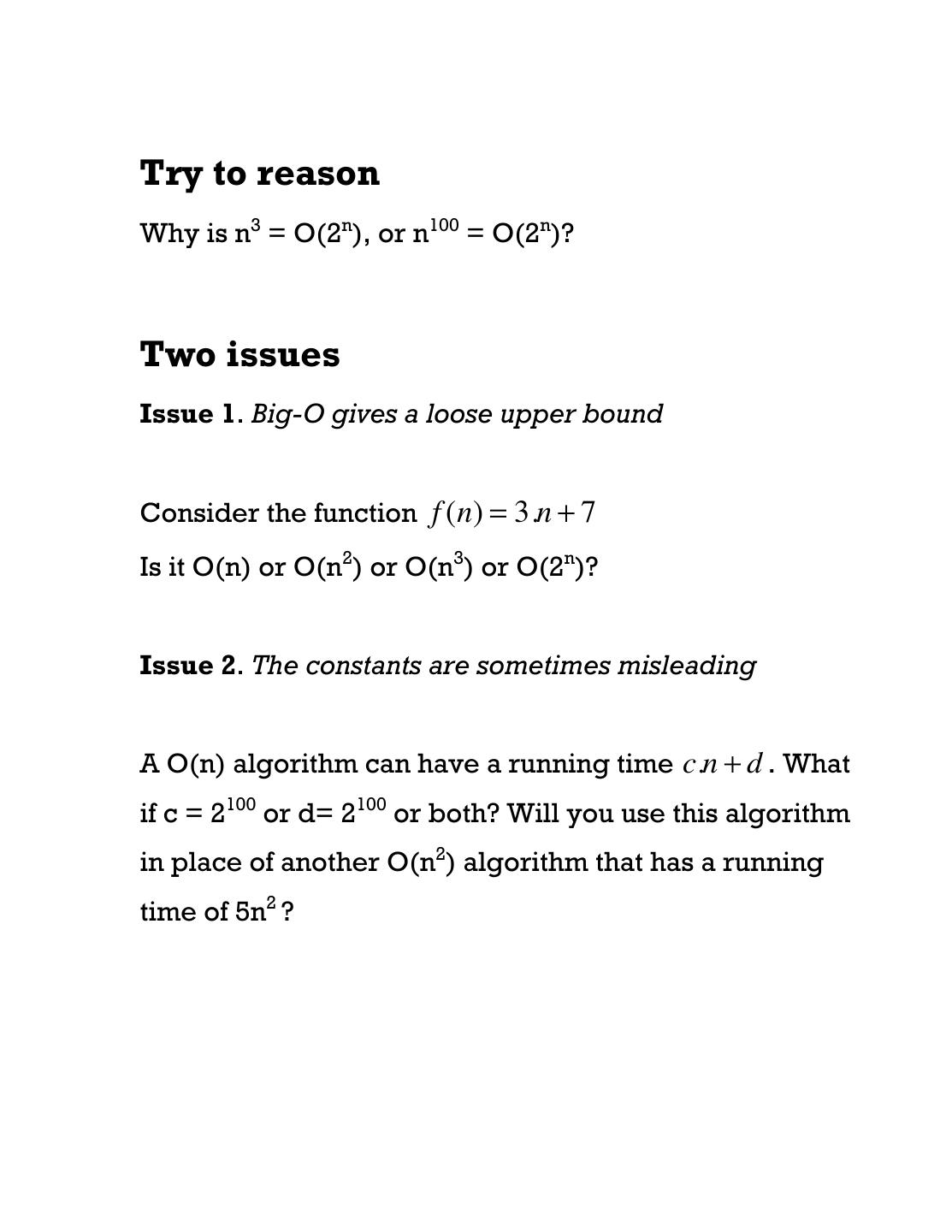 3 .Try to reason Why is n3 = O(2n), or n100 = O(2n)? Two issues Issue 1. Big-O gives a loose upper bound Consider the function f (n) = 3.n + 7 Is it O(n) or O(n2) or O(n3) or O(2n)? Issue 2. The constants are sometimes misleading A O(n) algorithm can have a running time c.n + d . What if c = 2100 or d= 2100 or both? Will you use this algorithm in place of another O(n2) algorithm that has a running time of 5n2 ?