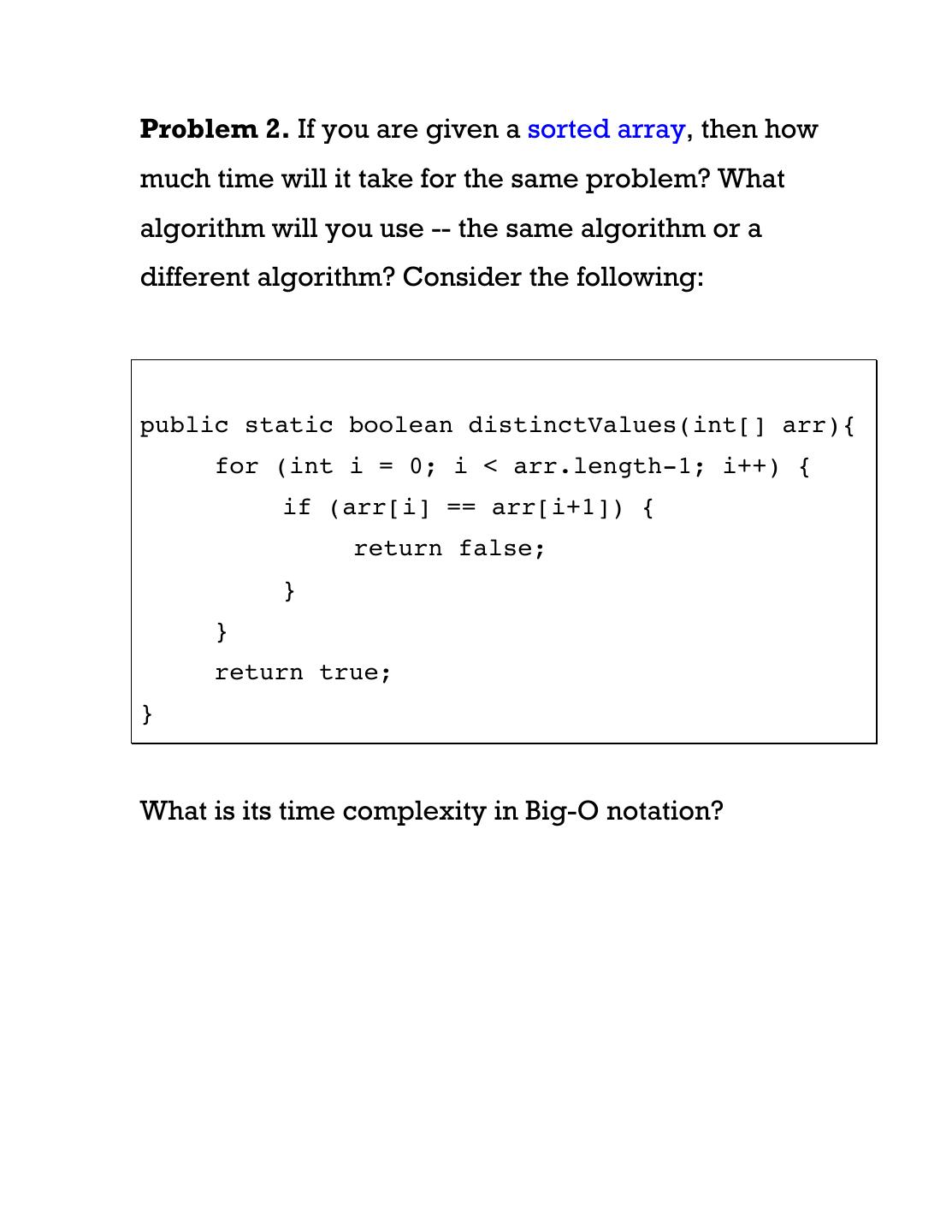 5 .Problem 2. If you are given a sorted array, then how much time will it take for the same problem? What algorithm will you use -- the same algorithm or a different algorithm? Consider the following: public static boolean distinctValues(int[] arr){ for (int i = 0; i < arr.length-1; i++) { if (arr[i] == arr[i+1]) { return false; } } return true; } What is its time complexity in Big-O notation?