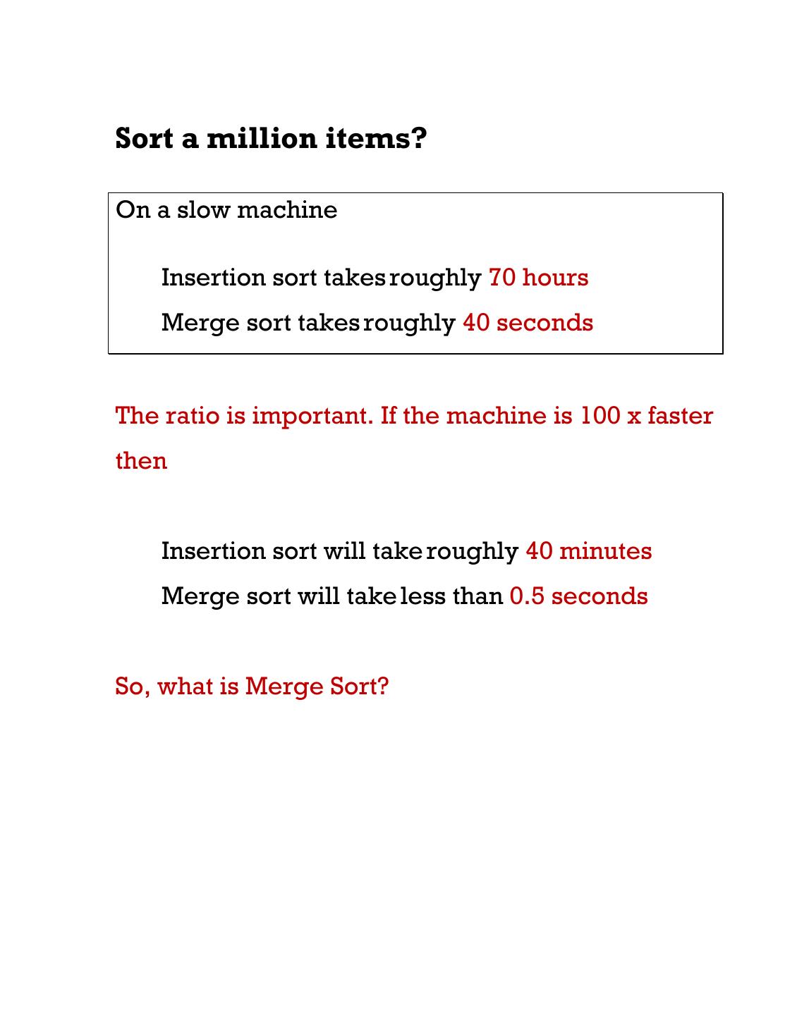 7 .Sort a million items? On a slow machine Insertion sort takes roughly 70 hours Merge sort takes roughly 40 seconds The ratio is important. If the machine is 100 x faster then Insertion sort will take roughly 40 minutes Merge sort will take less than 0.5 seconds So, what is Merge Sort?