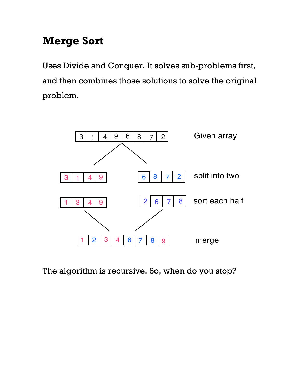 8 .Merge Sort Uses Divide and Conquer. It solves sub-problems first, and then combines those solutions to solve the original problem. 3 1 4 9 6 8 7 2 Given array 3 1 4 9 6 8 7 2 split into two 1 3 4 9 2 6 7 8 sort each half 1 2 3 4 6 7 8 9 merge The algorithm is recursive. So, when do you stop?