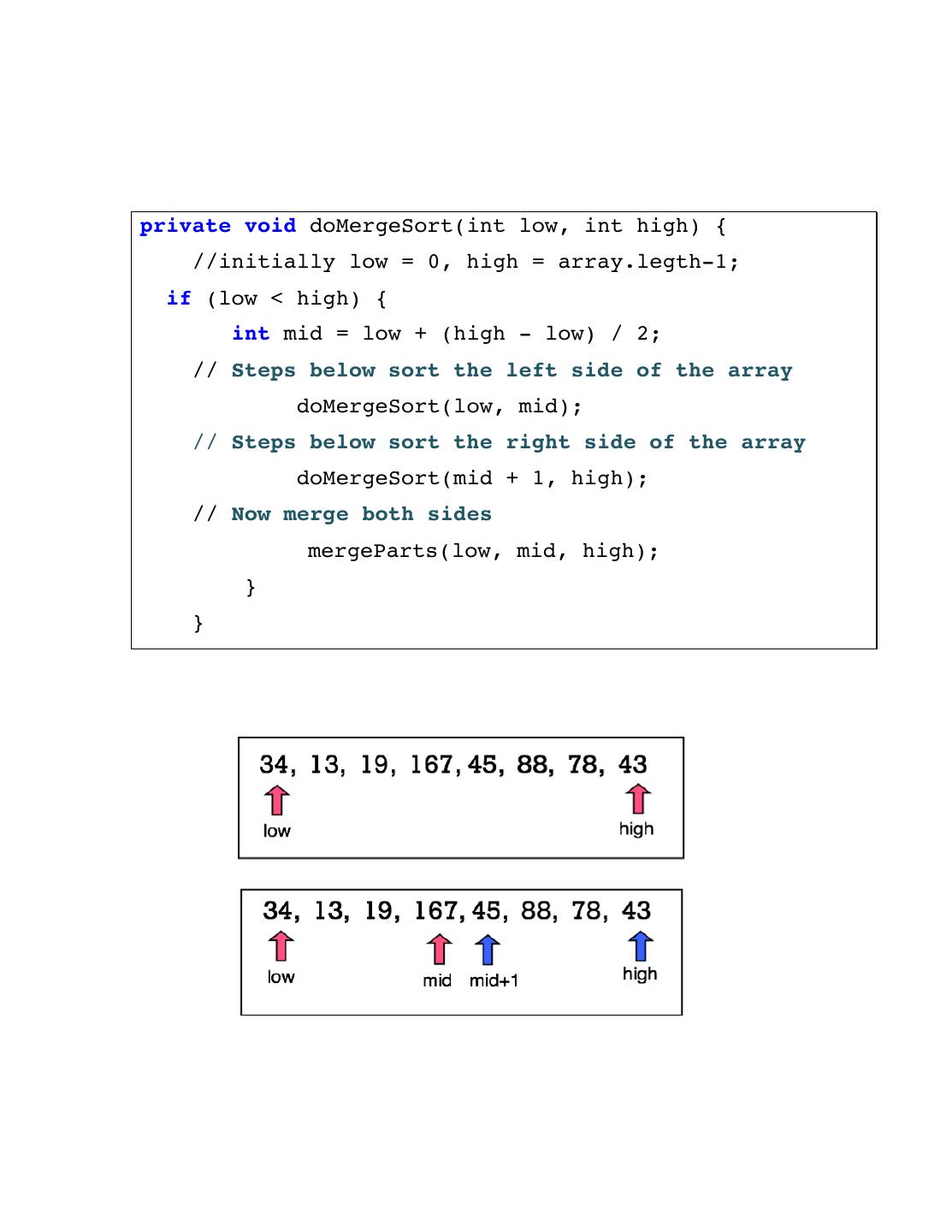 9 .private void doMergeSort(int low, int high) { //initially low = 0, high = array.legth-1; if (low < high) { int mid = low + (high - low) / 2; // Steps below sort the left side of the array doMergeSort(low, mid); // Steps below sort the right side of the array doMergeSort(mid + 1, high); // Now merge both sides mergeParts(low, mid, high); } }