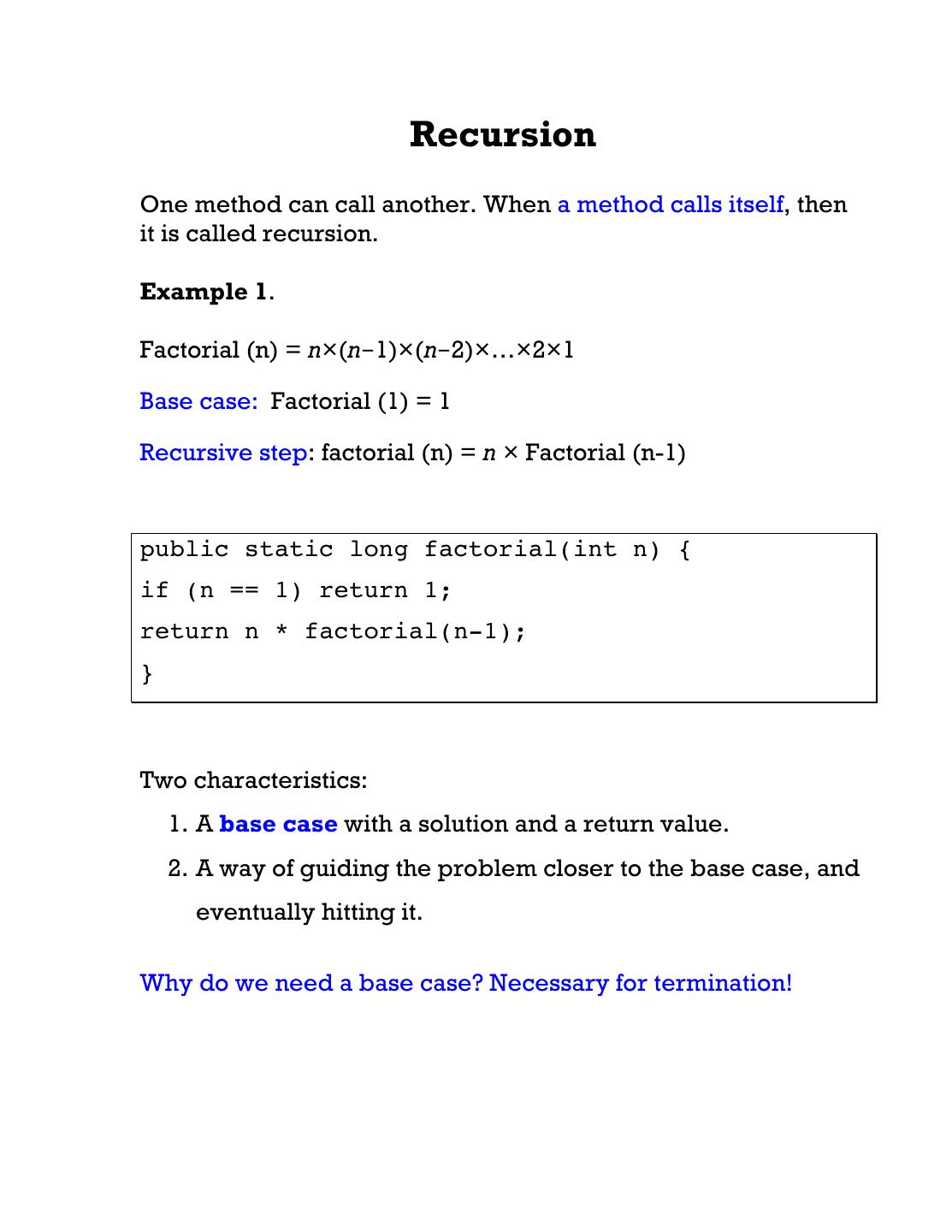 10 . Recursion One method can call another. When a method calls itself, then it is called recursion. Example 1. Factorial (n) = n×(n−1)×(n−2)×…×2×1 Base case: Factorial (1) = 1 Recursive step: factorial (n) = n × Factorial (n-1) public static long factorial(int n) { if (n == 1) return 1; return n * factorial(n-1); } Two characteristics: 1. A base case with a solution and a return value. 2. A way of guiding the problem closer to the base case, and eventually hitting it. Why do we need a base case? Necessary for termination!