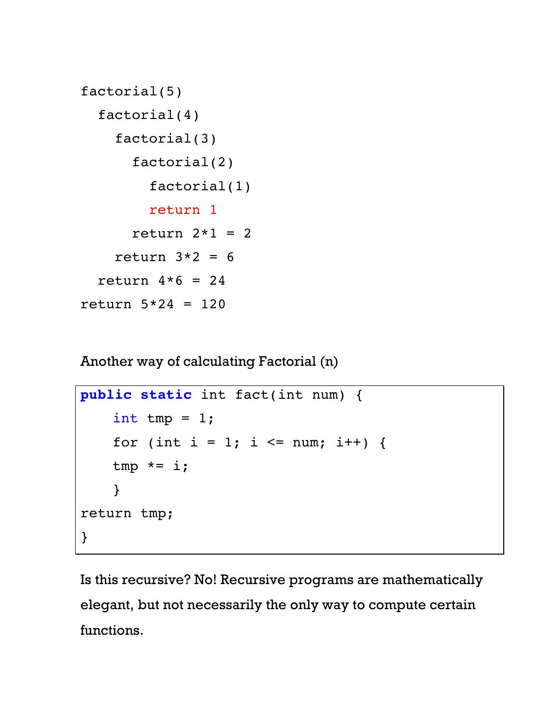 11 . factorial(5) factorial(4) factorial(3) factorial(2) factorial(1) return 1 return 2*1 = 2 return 3*2 = 6 return 4*6 = 24 return 5*24 = 120 Another way of calculating Factorial (n) public static int fact(int num) { int tmp = 1; for (int i = 1; i <= num; i++) { tmp *= i; } return tmp; } Is this recursive? No! Recursive programs are mathematically elegant, but not necessarily the only way to compute certain functions.