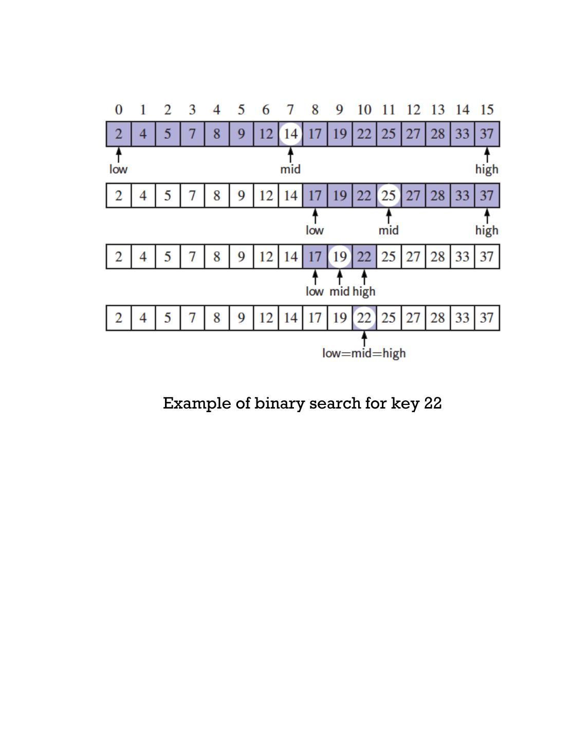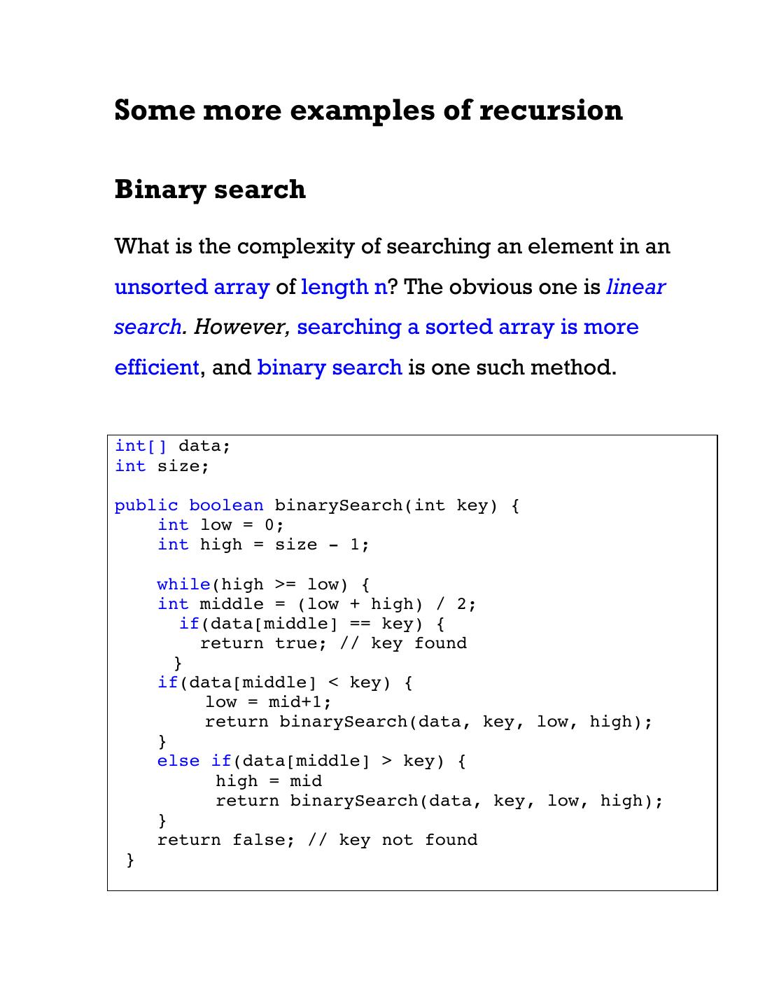 12 .Some more examples of recursion Binary search What is the complexity of searching an element in an unsorted array of length n? The obvious one is linear search. However, searching a sorted array is more efficient, and binary search is one such method. int[] data; int size; public boolean binarySearch(int key) { int low = 0; int high = size - 1; while(high >= low) { int middle = (low + high) / 2; if(data[middle] == key) { return true; // key found } if(data[middle] < key) { low = mid+1; return binarySearch(data, key, low, high); } else if(data[middle] > key) { high = mid return binarySearch(data, key, low, high); } return false; // key not found }