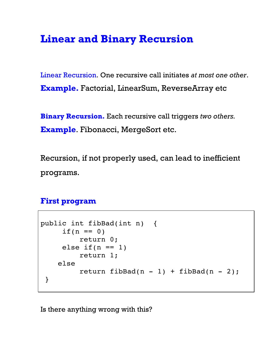14 .Linear and Binary Recursion Linear Recursion. One recursive call initiates at most one other. Example. Factorial, LinearSum, ReverseArray etc Binary Recursion. Each recursive call triggers two others. Example. Fibonacci, MergeSort etc. Recursion, if not properly used, can lead to inefficient programs. First program public int fibBad(int n) { if(n == 0) return 0; else if(n == 1) return 1; else return fibBad(n - 1) + fibBad(n - 2); } Is there anything wrong with this?