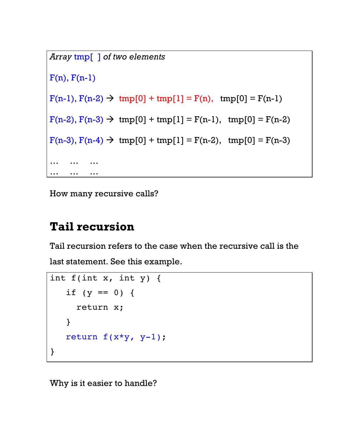 16 .Array tmp[ ] of two elements F(n), F(n-1) F(n-1), F(n-2) à tmp[0] + tmp[1] = F(n), tmp[0] = F(n-1) F(n-2), F(n-3) à tmp[0] + tmp[1] = F(n-1), tmp[0] = F(n-2) F(n-3), F(n-4) à tmp[0] + tmp[1] = F(n-2), tmp[0] = F(n-3) … … … … … … How many recursive calls? Tail recursion Tail recursion refers to the case when the recursive call is the last statement. See this example. int f(int x, int y) { if (y == 0) { return x; } return f(x*y, y-1); } Why is it easier to handle?