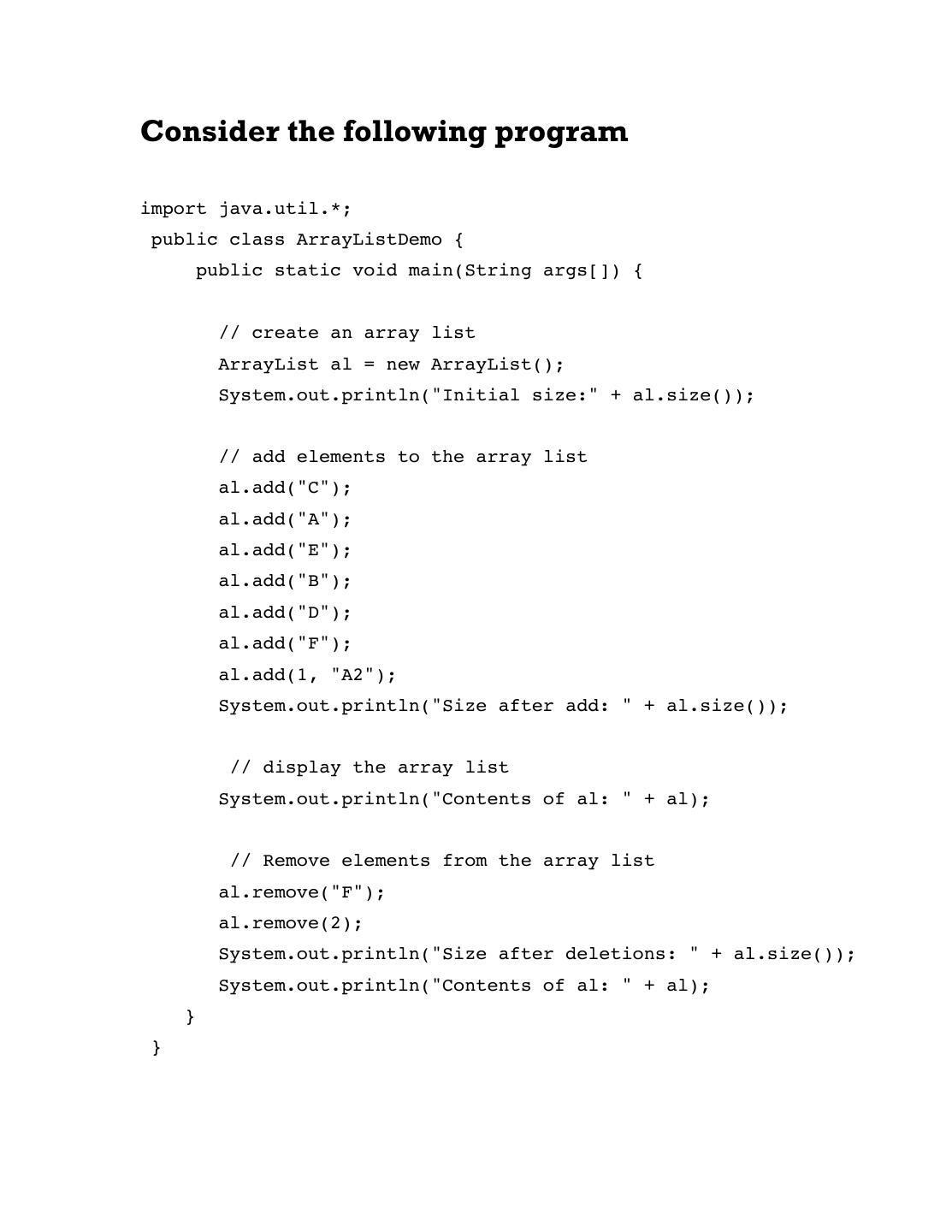 17 .Consider the following program import java.util.*; public class ArrayListDemo { public static void main(String args[]) { // create an array list ArrayList al = new ArrayList(); System.out.println("Initial size:" + al.size()); // add elements to the array list al.add("C"); al.add("A"); al.add("E"); al.add("B"); al.add("D"); al.add("F"); al.add(1, "A2"); System.out.println("Size after add: " + al.size()); // display the array list System.out.println("Contents of al: " + al); // Remove elements from the array list al.remove("F"); al.remove(2); System.out.println("Size after deletions: " + al.size()); System.out.println("Contents of al: " + al); } }