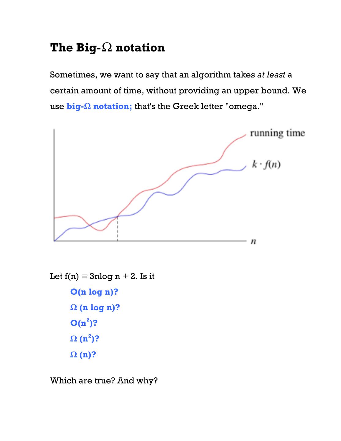 19 .The Big- Ω notation Sometimes, we want to say that an algorithm takes at least a certain amount of time, without providing an upper bound. We use big-Ω notation; that's the Greek letter "omega." Let f(n) = 3nlog n + 2. Is it O(n log n)? Ω (n log n)? O(n2)? Ω (n2)? Ω (n)? Which are true? And why?