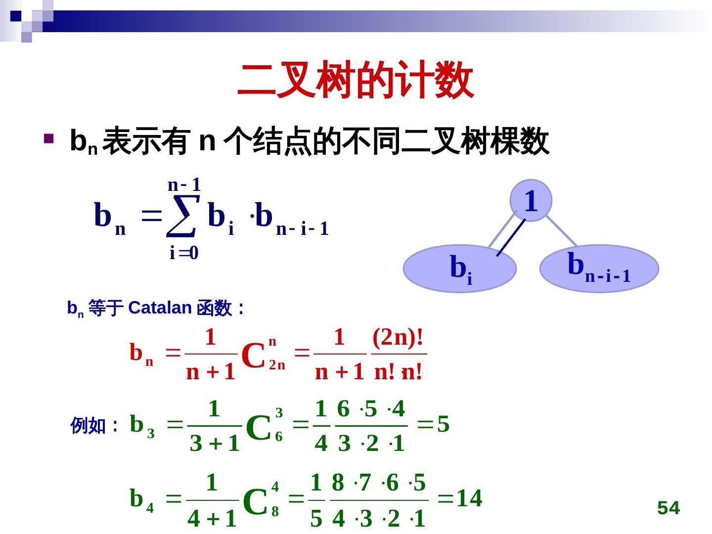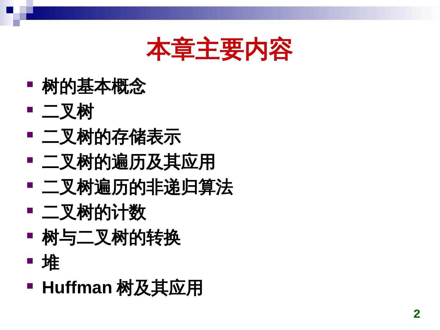 2 . 本章主要内容 树的基本概念 二叉树 二叉树的存储表示 二叉树的遍历及其应用 二叉树遍历的非递归算法 二叉树的计数 树与二叉树的转换 堆 Huffman 树及其应用 2