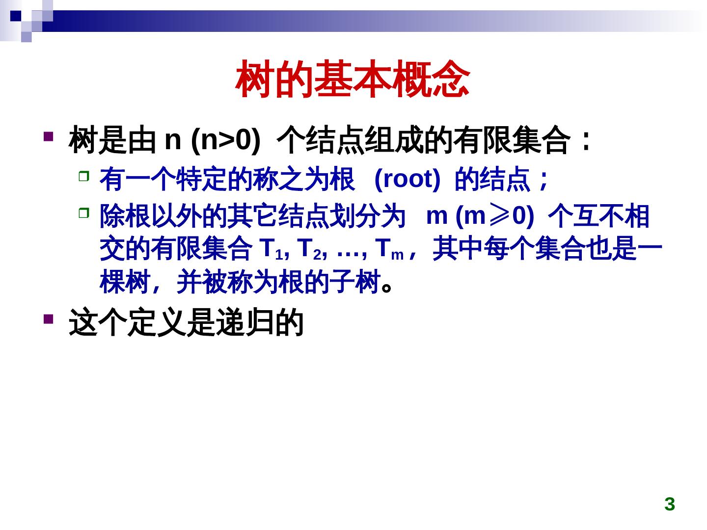 3 . 树的基本概念 树是由 n (n>0) 个结点组成的有限集合: 有一个特定的称之为根 (root) ) 的结点; 除根以外的其它结点划分为 m (m≥0) 个互不相 交的有限集合 T1, T2, …, Tm ,其中每个集合也是一其中每个集合也是一 棵树,其中每个集合也是一并被称为根的子树。 这个定义是递归的 3