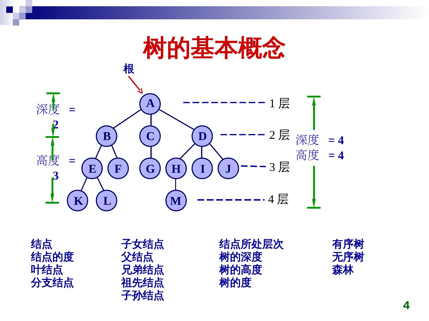 4 . 树的基本概念 根 A 1层 深度 = 2 B C D 2 层 深度 = 4 高度 = 高度 = 4 E F G H I J 3层 3 K L M 4层 结点 子女结点 结点所处层次 有序树 结点的度 父结点 树的深度 无序树 叶结点 兄弟结点 树的高度 森林 分支结点 祖先结点 树的度 子孙结点 4