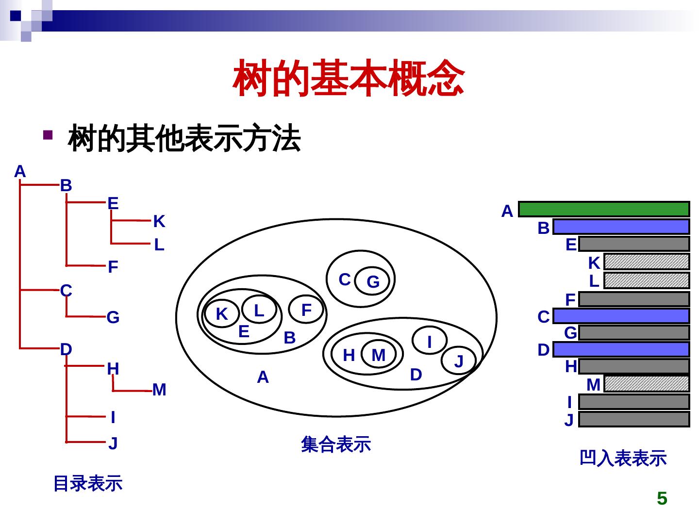 5 . 树的基本概念 树的其他表示方法 A B E A K B L E F K C G L C F G K L F C E B G D I D H M J H D H A M M I I J J 集合表示 凹入表表示 目录表示 5