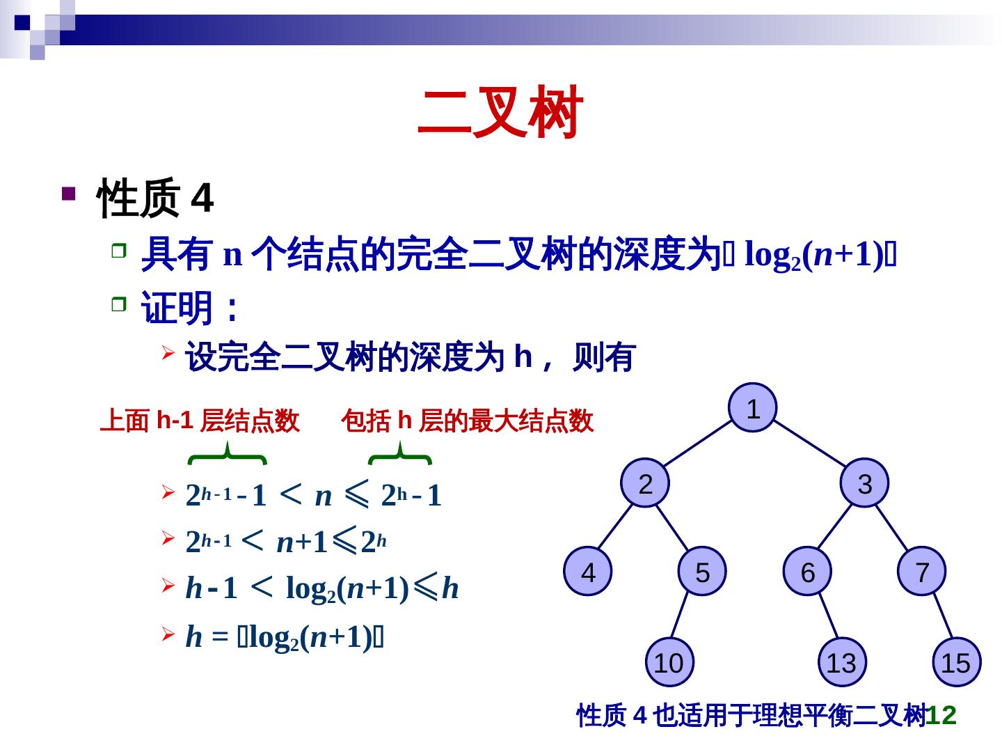 12 . 二叉树 性质 4 具有 n 个结点的完全二叉树的深度为 log2(n+1) 证明: 设完全二叉树的深度为 h ,其中每个集合也是一则有 上面 h-1 层结点数 包括 h 层的最大结点数 1 2h-1-1 < n ≤ 2h-1 2 3 2h-1 < n+1≤2h h-1 < log2(n+1)≤h 4 5 6 7 h = log2(n+1) 10 13 15 性质 4 也适用于理想平衡二叉树12