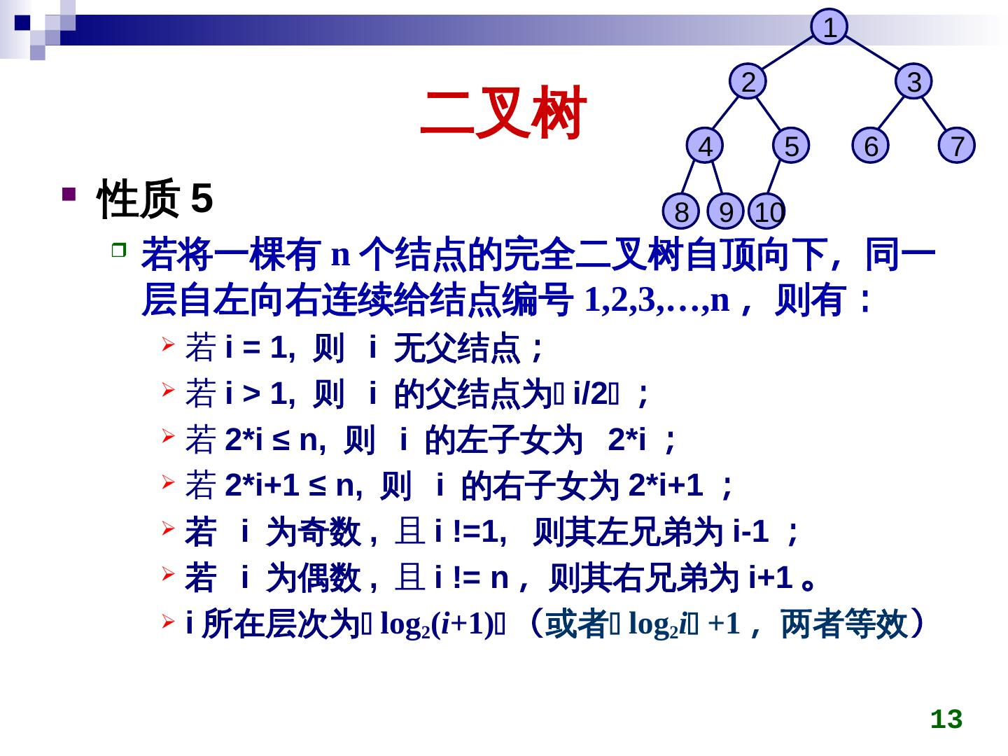 13 . 1 2 3 二叉树 4 5 6 7 性质 5 8 9 10 若将一棵有 n 个结点的完全二叉树自顶向下,其中每个集合也是一同一 层自左向右连续给结点编号 1,2,3,…,n ,其中每个集合也是一则有: 若 i = 1, 则 i 无父结点; 若 i > 1, 则 i 的父结点为 i/2 ; 若 2*i ≤ n, 则 i 的左子女为 2*i ; 若 2*i+1 ≤ n, 则 i 的右子女为 2*i+1 ; 若 i 为奇数 , 且 i !=1, 则其左兄弟为 i-1 ; 若 i 为偶数 , 且 i != n ,其中每个集合也是一则其右兄弟为 i+1 。 i 所在层次为 log2(i+1) (或者 log2i +1 ,其中每个集合也是一两者等效) 13