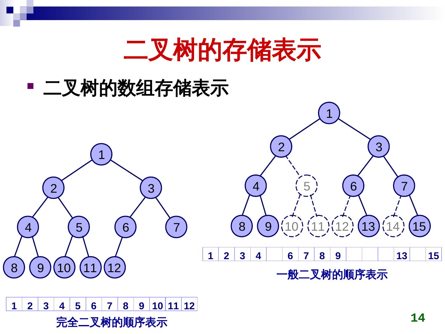14 . 二叉树的存储表示 二叉树的数组存储表示 1 2 3 1 2 3 4 5 6 7 4 5 6 7 8 9 10 11 12 13 14 15 1 2 3 4 6 7 8 9 13 15 8 9 10 11 12 一般二叉树的顺序表示 1 2 3 4 5 6 7 8 9 10 11 12 完全二叉树的顺序表示 14