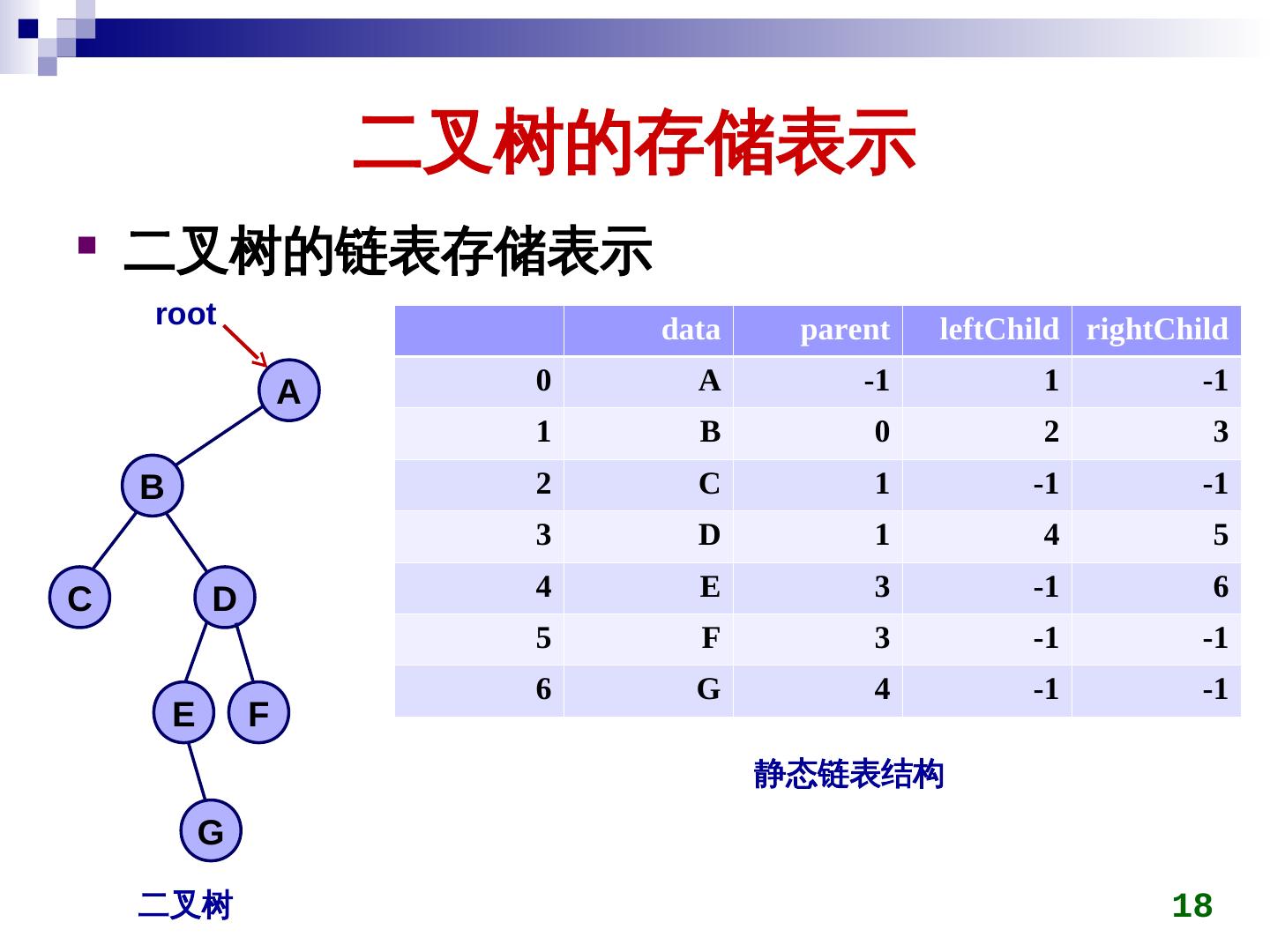 18 . 二叉树的存储表示 二叉树的链表存储表示 root) data parent leftChild rightChild A 0 A -1 1 -1 1 B 0 2 3 B 2 C 1 -1 -1 3 D 1 4 5 C D 4 E 3 -1 6 5 F 3 -1 -1 6 G 4 -1 -1 E F 静态链表结构 G 二叉树 18