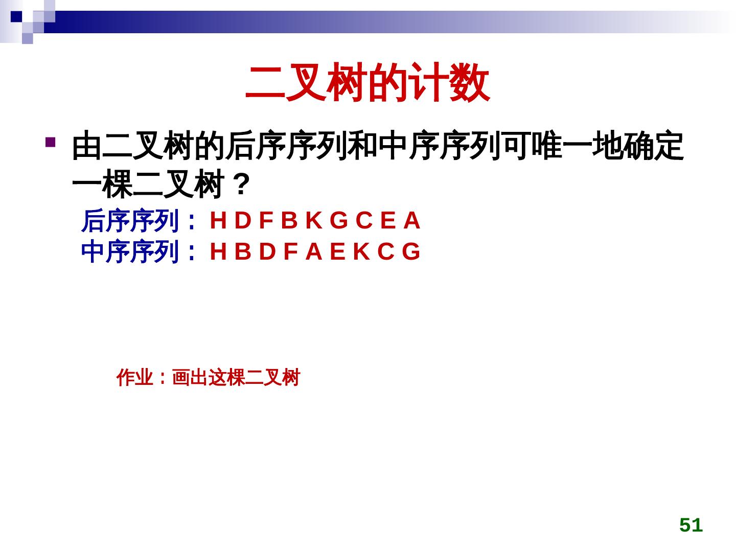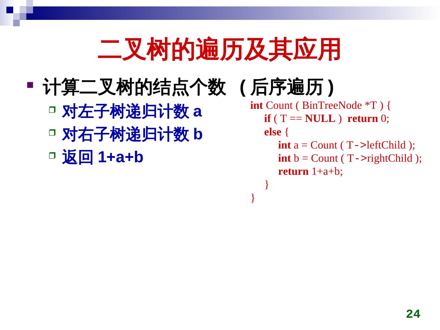 24 . 二叉树的遍历及其应用 计算二叉树的结点个数 ( 后序遍历 ) int Count ( BinTreeNode *T ) { 对左子树递归计数 a if ( T == NULL ) return 0; 对右子树递归计数 b else { int a = Count ( T->leftChild ); 返回 1+a+b int b = Count ( T->rightChild ); return 1+a+b; } } 24