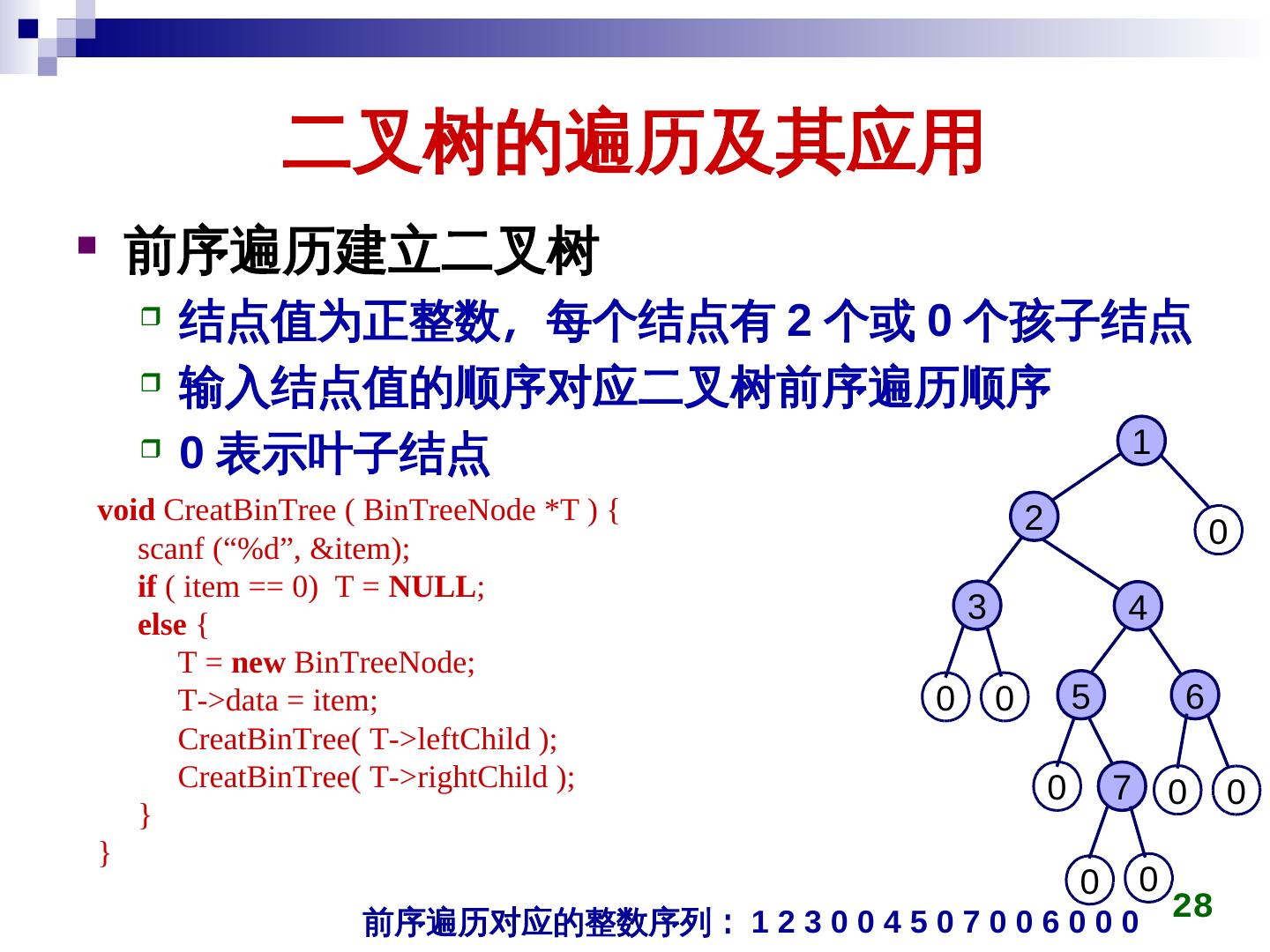 28 . 二叉树的遍历及其应用 前序遍历建立二叉树 结点值为正整数,其中每个集合也是一每个结点有 2 个或 0 个孩子结点 输入结点值的顺序对应二叉树前序遍历顺序 0 表示叶子结点 1 void CreatBinTree ( BinTreeNode *T ) { 2 scanf (“%d”, &item); 0 if ( item == 0) T = NULL; else { 3 4 T = new BinTreeNode; T->data = item; 0 0 5 6 CreatBinTree( T->leftChild ); CreatBinTree( T->rightChild ); 0 7 0 0 } } 0 0 前序遍历对应的整数序列: 1 2 3 0 0 4 5 0 7 0 0 6 0 0 0 28
