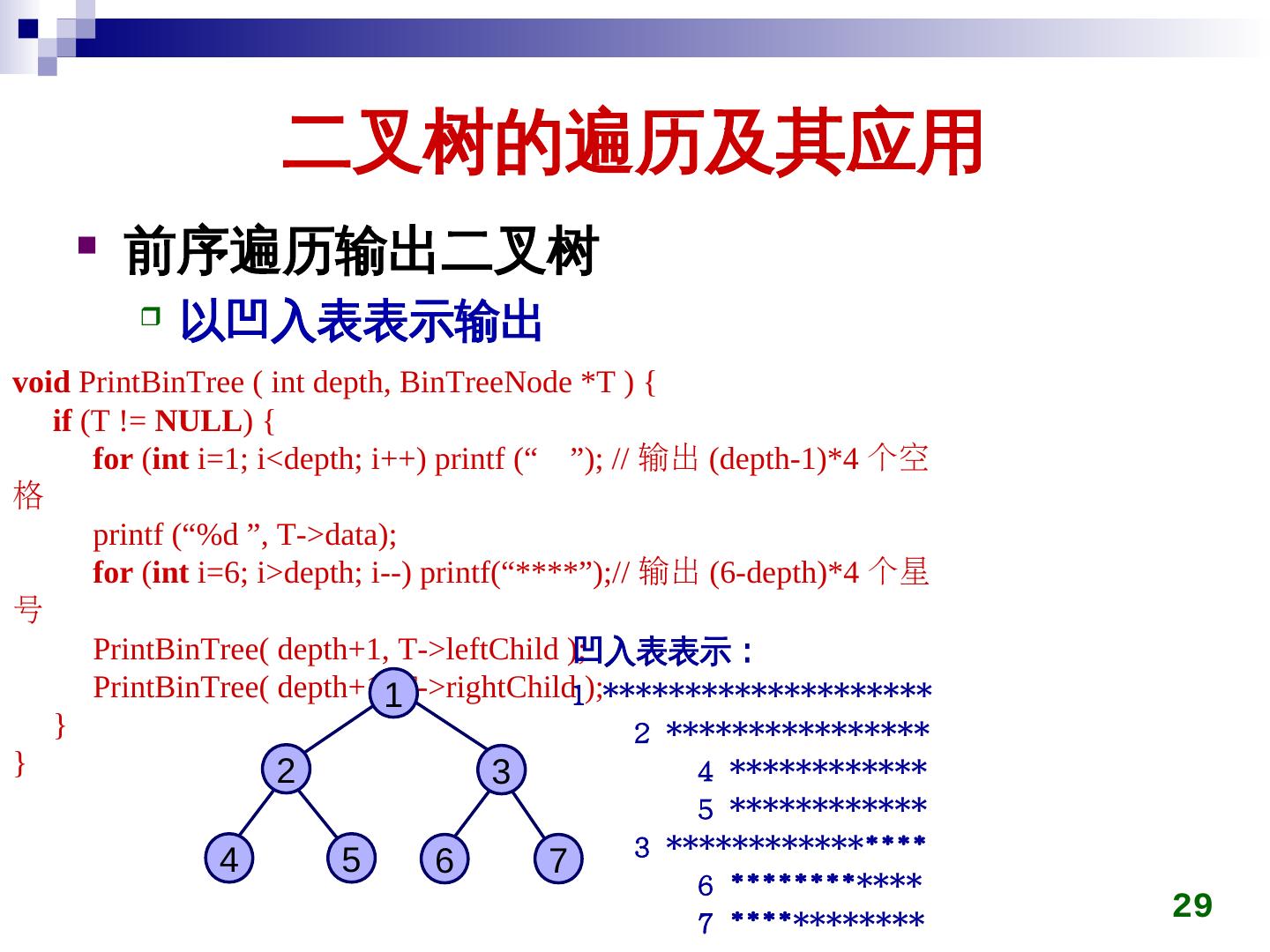 29 . 二叉树的遍历及其应用 前序遍历输出二叉树 以凹入表表示输出 void PrintBinTree ( int depth, BinTreeNode *T ) { if (T != NULL) { for (int i=1; i<depth; i++) printf (“ ”); // 输出 (depth-1)*4 个空 格 printf (“%d ”, T->data); for (int i=6; i>depth; i--) printf(“****”);// 输出 (6-depth)*4 个星 号 PrintBinTree( depth+1, T->leftChild );凹入表表示: PrintBinTree( depth+1,1T->rightChild1);******************** } 2 **************** } 2 3 4 ************ 5 ************ 4 5 6 7 3 **************** 6 ************ 29 7 ************