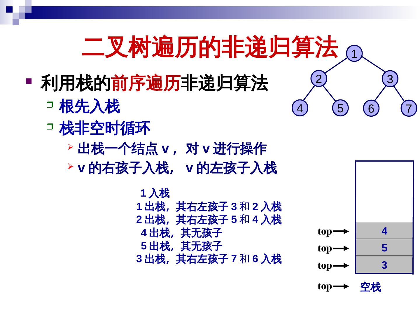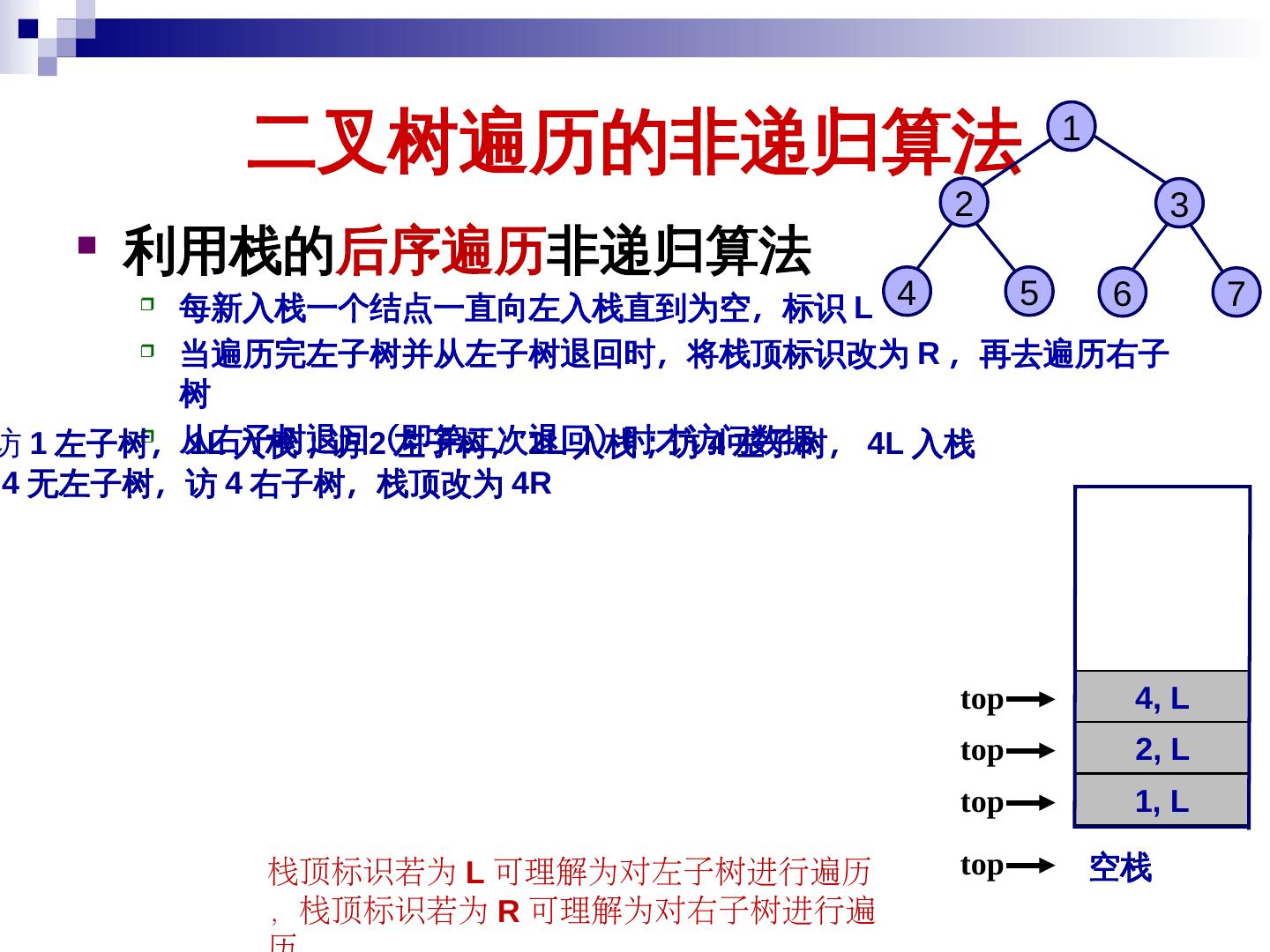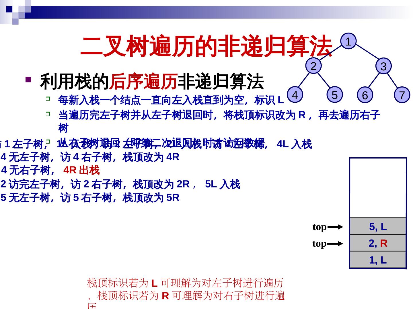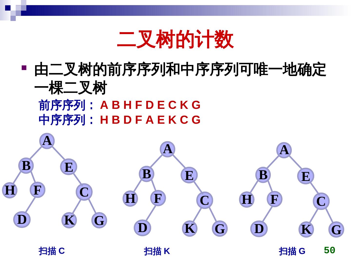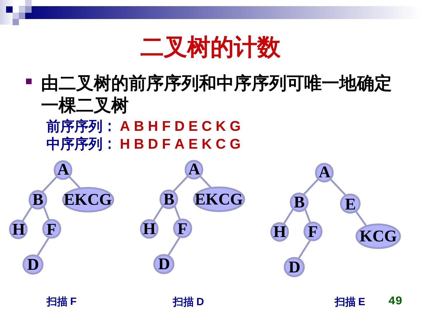 19 . 二叉树的遍历及其应用 二叉树的遍历就是按某种次序访问树中的结点 一次且仅一次 访问当前结点记为 V 访问结点的左子树记为 L 访问结点的右子树记为 R 遍历次序一般有 前序遍历 (VLR) 中序遍历 (LVR) 后序遍历 (LRV) 19