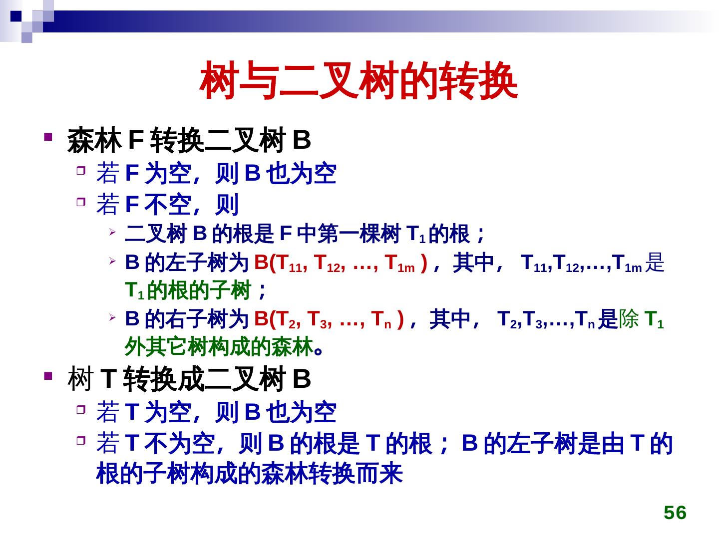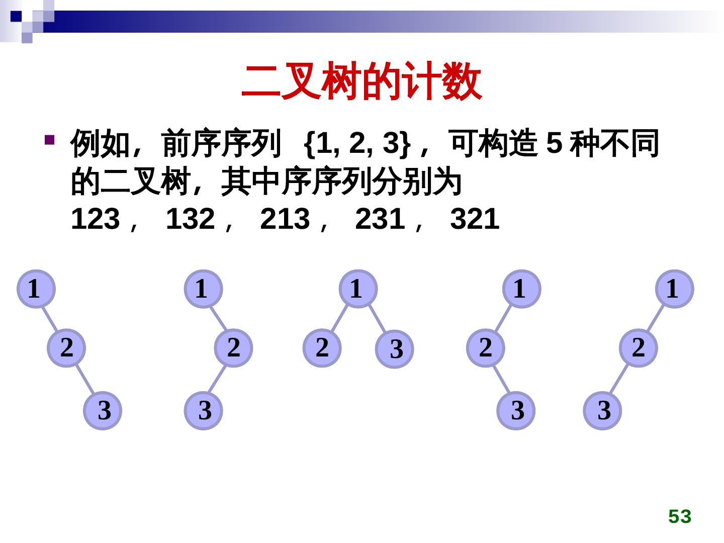 27 . 二叉树的遍历及其应用 判断两棵二叉树是否相等 ( 前序遍历 ) 判断两棵树数据是否相等 判断两棵树左子树是否相等 判断两棵右子树是否相等 bool BinTreeNode * equal ( BinTreeNode *a, BinTreeNode *b ) { if ( a == NULL && b == NULL ) return true; else if ( a!=NULL && b!=NULL ) { bool r = ( a->data == b->data ); bool s = equal ( a->leftChild, b->leftChild ); bool t = equal ( a->rightChild, b->rightChild ); if (r && s && t) return true; else return false; } else return false; } 27