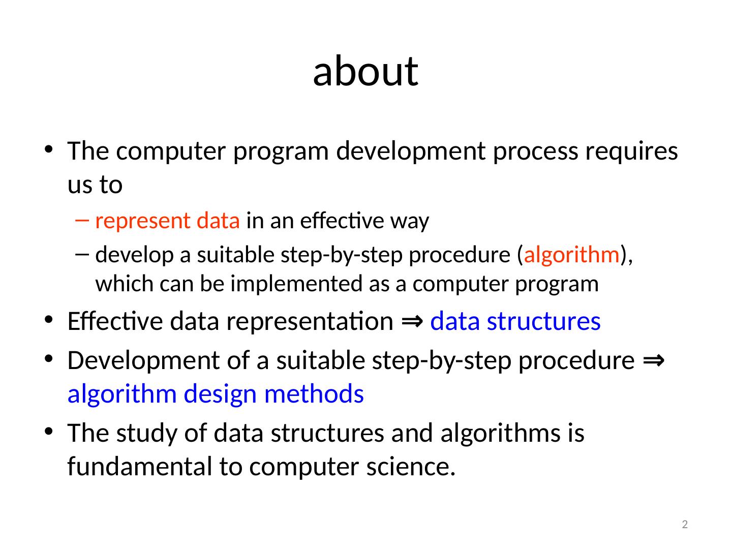 2 .2 about The computer program development process requires us to represent data in an effective way develop a suitable step-by-step procedure ( algorithm ), which can be implemented as a computer program Effective data representation ⇒ data structures Development of a suitable step-by-step procedure ⇒ algorithm design methods The study of data structures and algorithms is fundamental to computer science.