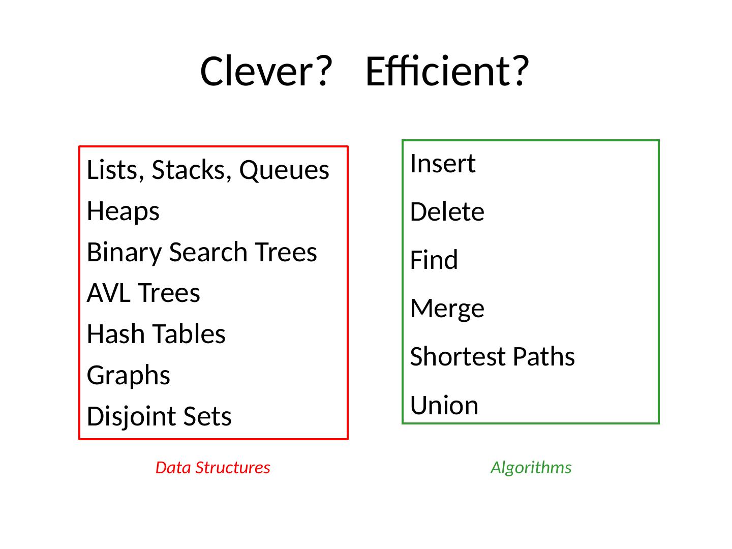 4 .Clever? Efficient? Lists, Stacks, Queues Heaps Binary Search Trees AVL Trees Hash Tables Graphs Disjoint Sets Insert Delete Find Merge Shortest Paths Union Data Structures Algorithms