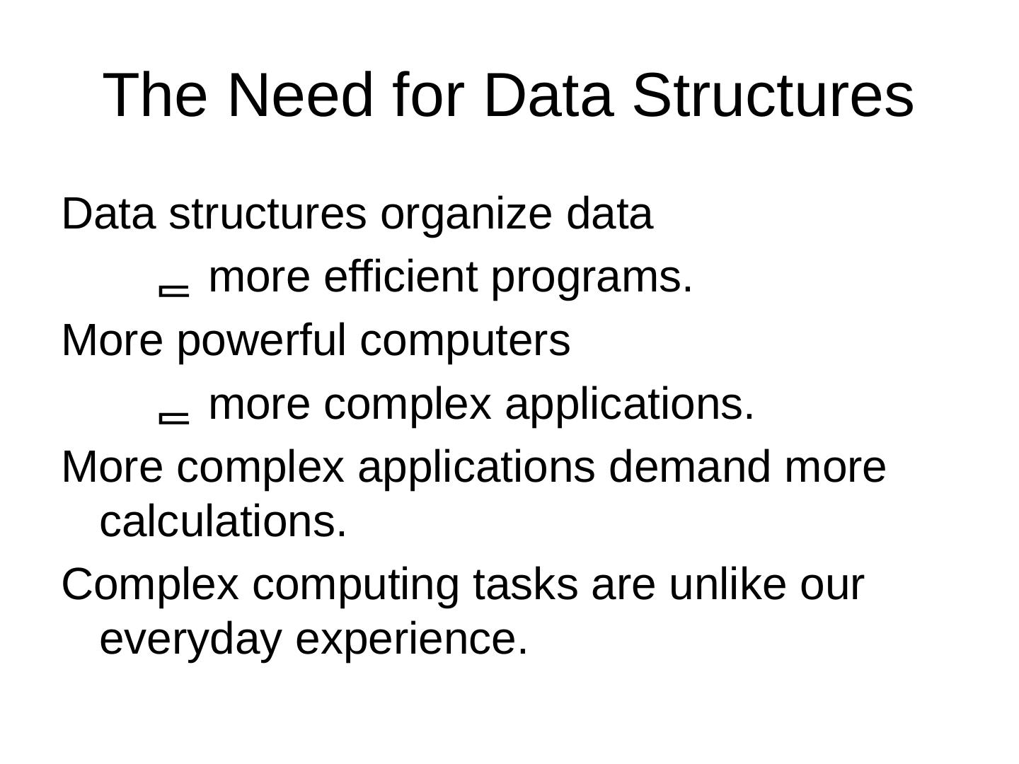 5 .The Need for Data Structures Data structures organize data more efficient programs. More powerful computers more complex applications. More complex applications demand more calculations. Complex computing tasks are unlike our everyday experience.