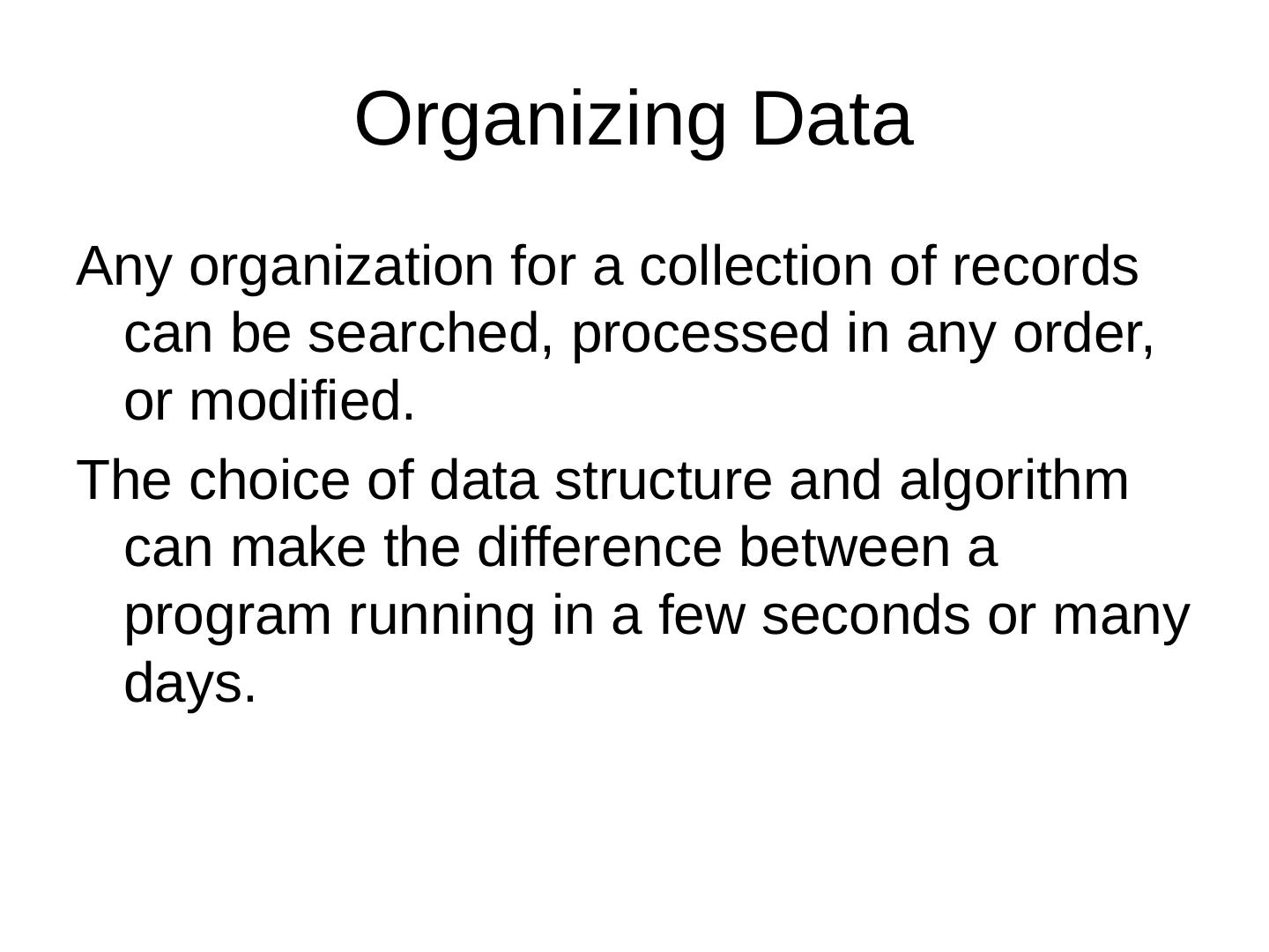 6 .Organizing Data Any organization for a collection of records can be searched, processed in any order, or modified. The choice of data structure and algorithm can make the difference between a program running in a few seconds or many days.