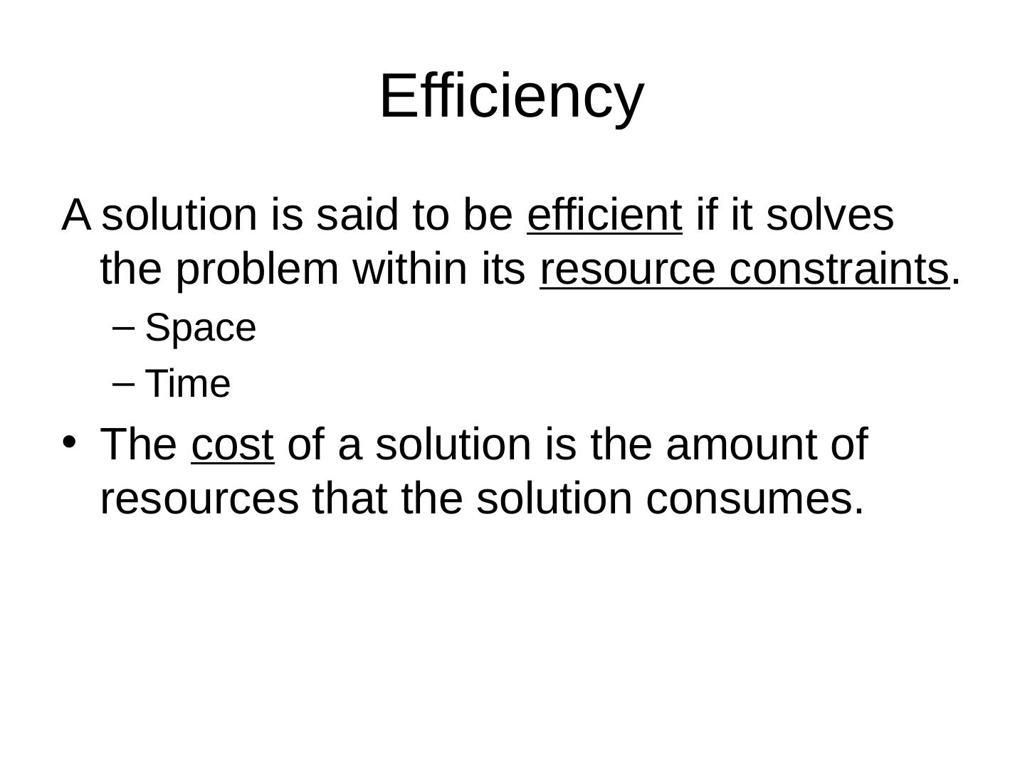 7 .Efficiency A solution is said to be efficient if it solves the problem within its resource constraints . Space Time The cost of a solution is the amount of resources that the solution consumes.