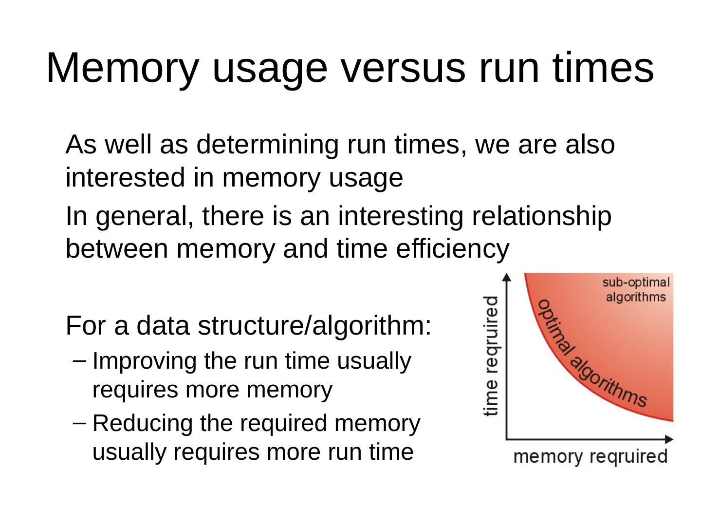 8 .Memory usage versus run times As well as determining run times, we are also interested in memory usage In general, there is an interesting relationship between memory and time efficiency For a data structure/algorithm: Improving the run time usually requires more memory Reducing the required memory usually requires more run time