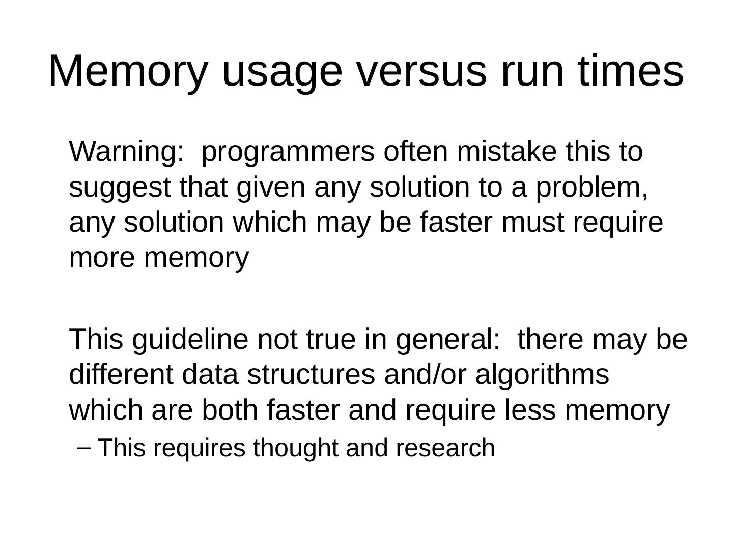 9 .Memory usage versus run times Warning: programmers often mistake this to suggest that given any solution to a problem, any solution which may be faster must require more memory This guideline not true in general: there may be different data structures and/or algorithms which are both faster and require less memory This requires thought and research