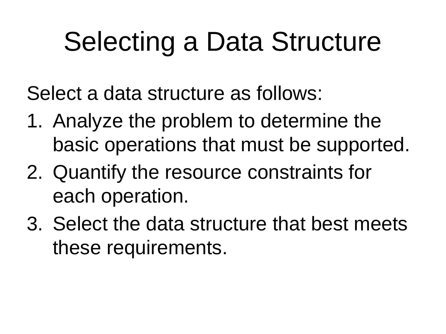 10 .Selecting a Data Structure Select a data structure as follows: Analyze the problem to determine the basic operations that must be supported. Quantify the resource constraints for each operation. Select the data structure that best meets these requirements.