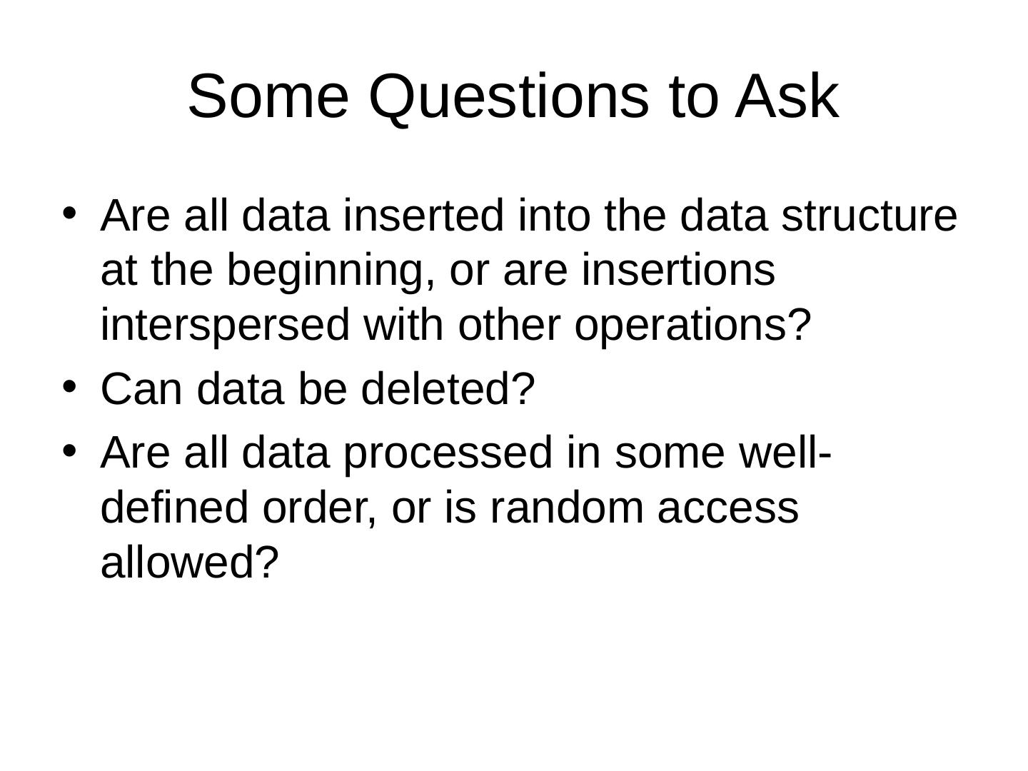 11 .Some Questions to Ask Are all data inserted into the data structure at the beginning, or are insertions interspersed with other operations? Can data be deleted? Are all data processed in some well-defined order, or is random access allowed?