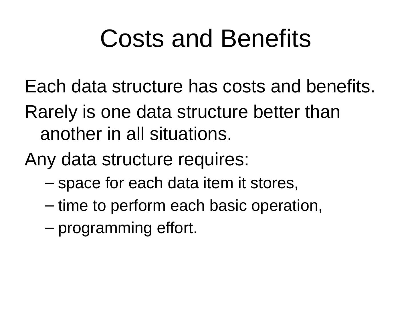 12 .Costs and Benefits Each data structure has costs and benefits. Rarely is one data structure better than another in all situations. Any data structure requires: space for each data item it stores, time to perform each basic operation, programming effort.