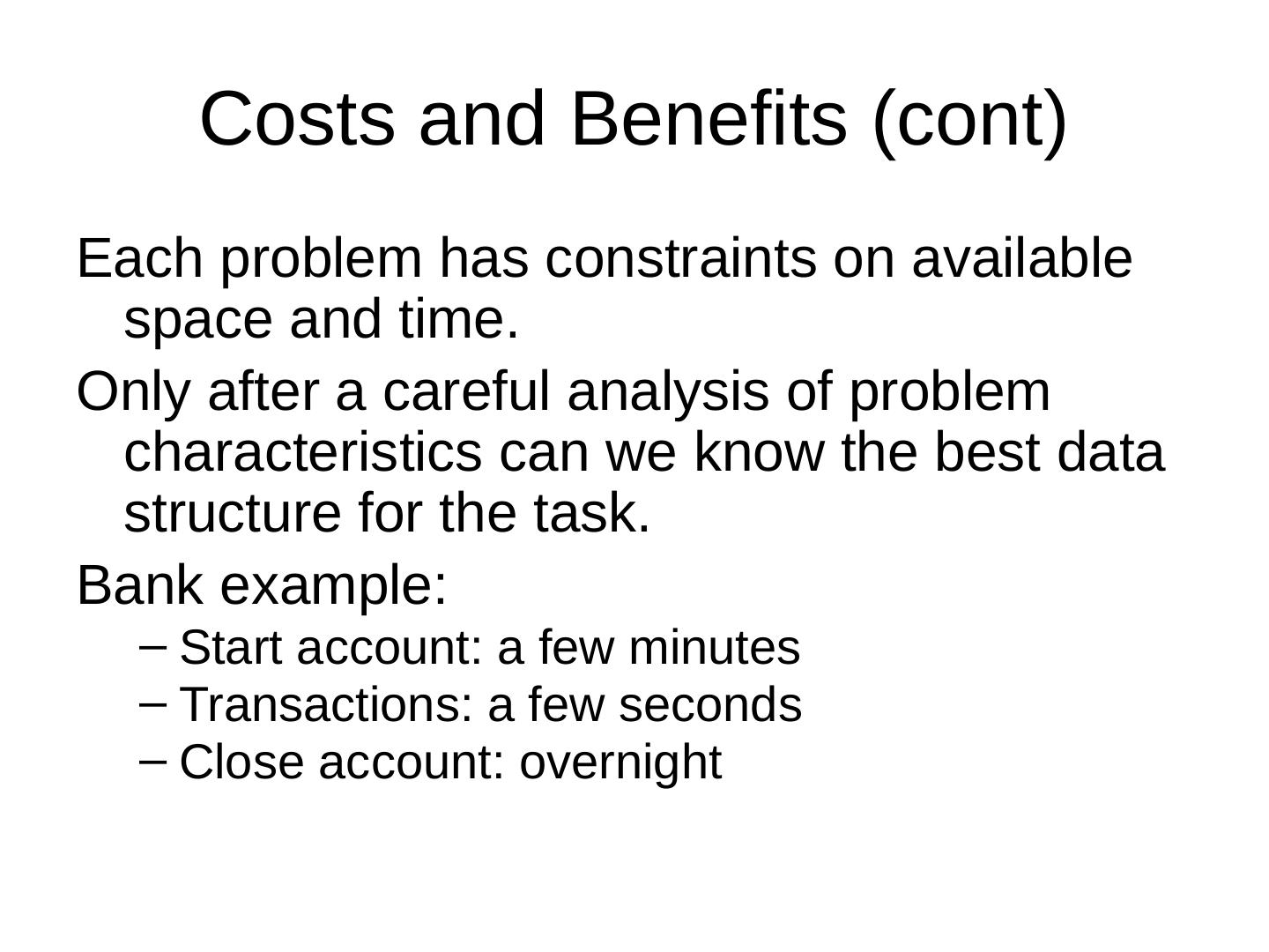 13 .Costs and Benefits (cont) Each problem has constraints on available space and time. Only after a careful analysis of problem characteristics can we know the best data structure for the task. Bank example: Start account: a few minutes Transactions: a few seconds Close account: overnight