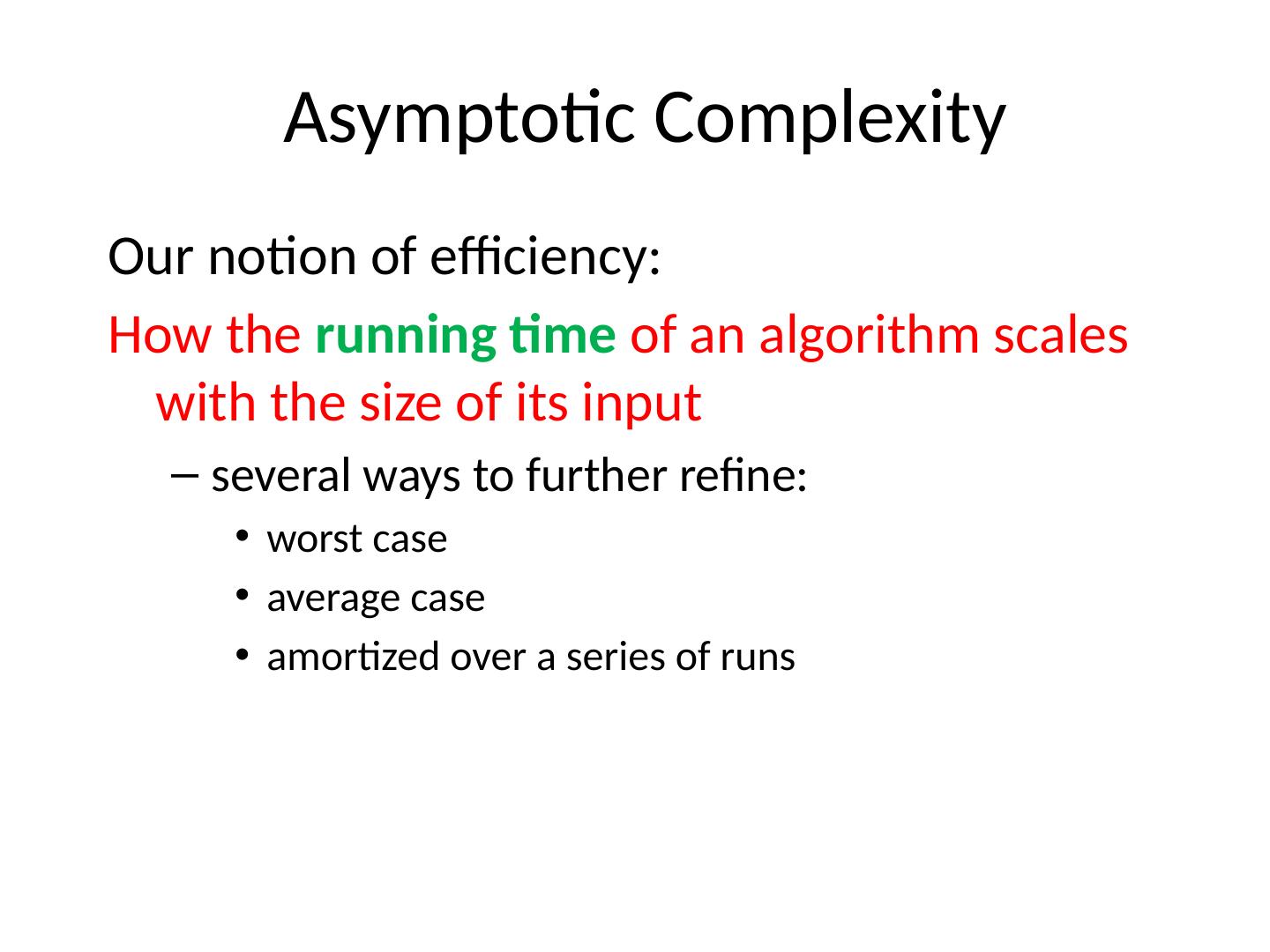 14 .Asymptotic Complexity Our notion of efficiency: How the running time of an algorithm scales with the size of its input several ways to further refine: worst case average case amortized over a series of runs