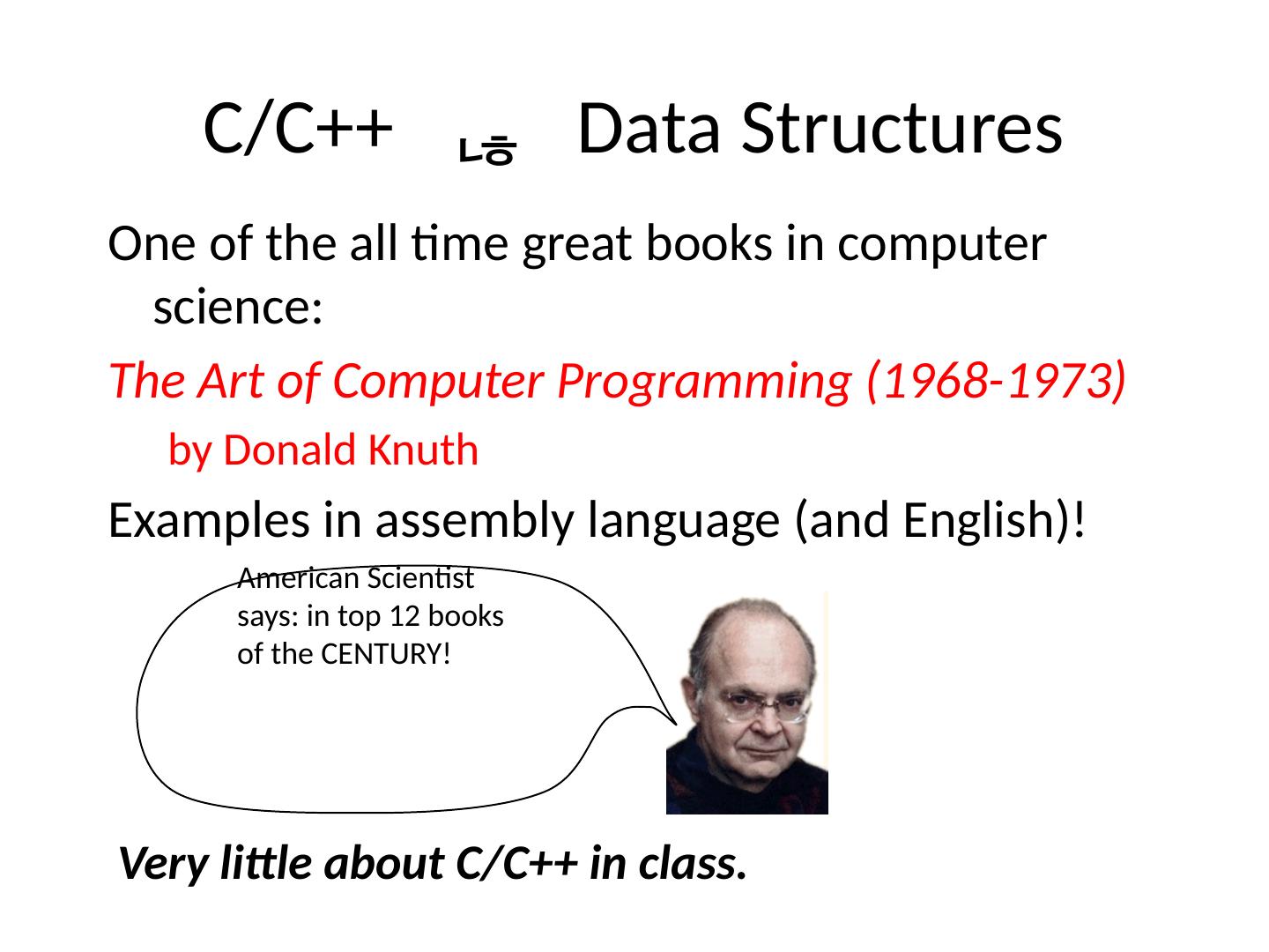 15 .C/C ++ Data Structures One of the all time great books in computer science: The Art of Computer Programming (1968-1973) by Donald Knuth Examples in assembly language (and English)! American Scientist says: in top 12 books of the CENTURY! Very little about C/C ++ in class.