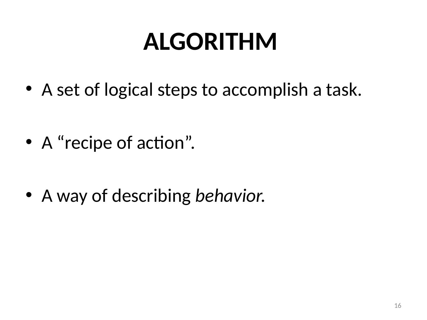 16 .16 ALGORITHM A set of logical steps to accomplish a task. A “recipe of action”. A way of describing behavior.