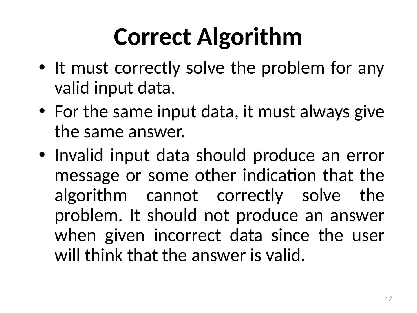 17 .17 Correct Algorithm It must correctly solve the problem for any valid input data. For the same input data, it must always give the same answer. Invalid input data should produce an error message or some other indication that the algorithm cannot correctly solve the problem. It should not produce an answer when given incorrect data since the user will think that the answer is valid.