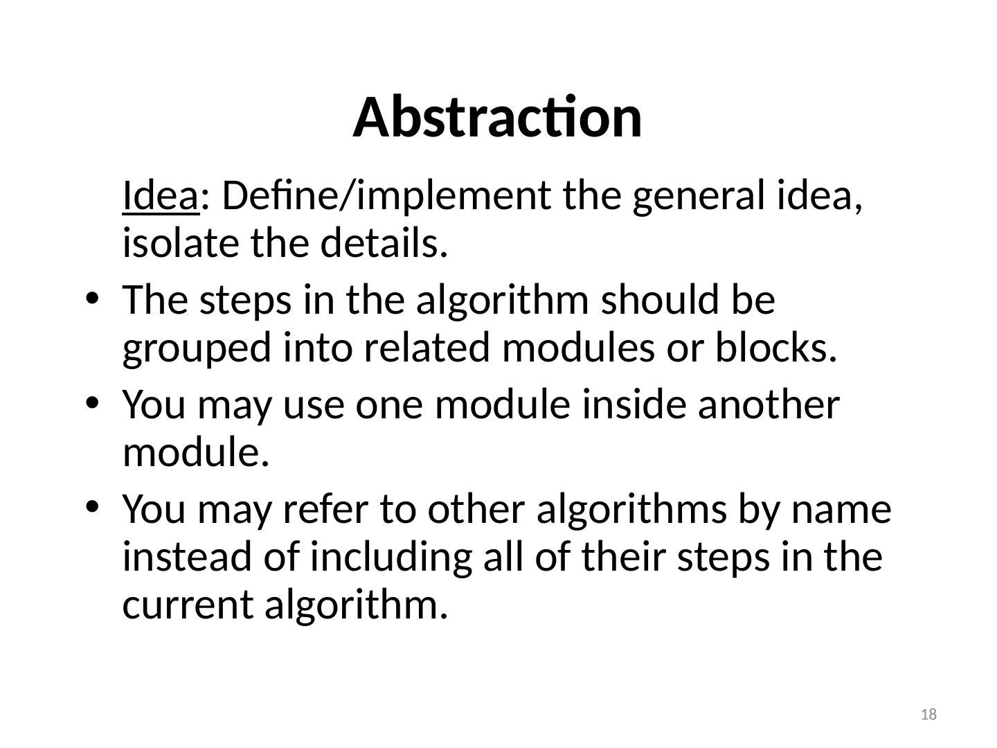 18 .18 Abstraction Idea : Define/implement the general idea, isolate the details. The steps in the algorithm should be grouped into related modules or blocks. You may use one module inside another module. You may refer to other algorithms by name instead of including all of their steps in the current algorithm.