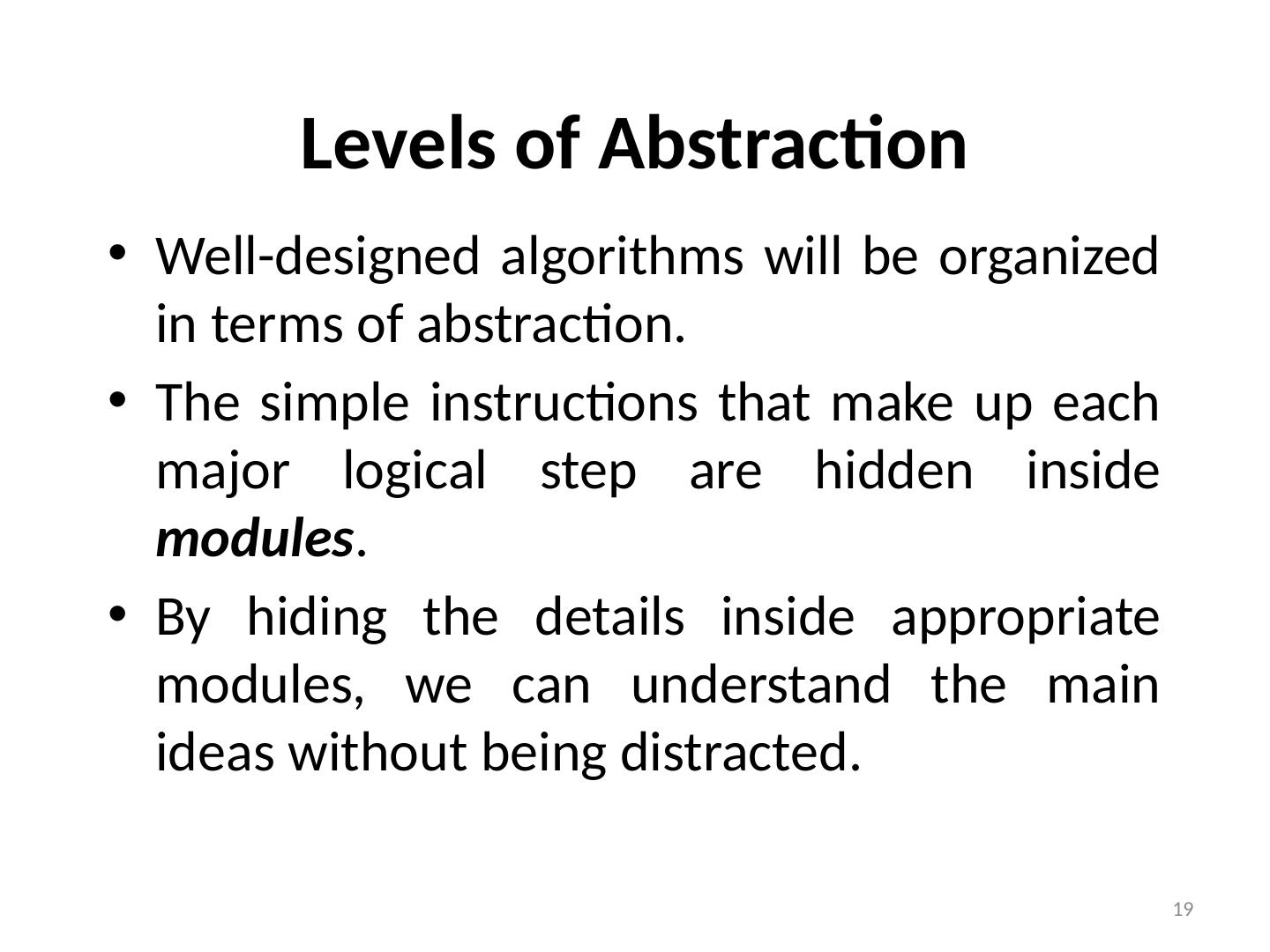 19 .19 Levels of Abstraction Well-designed algorithms will be organized in terms of abstraction. The simple instructions that make up each major logical step are hidden inside modules . By hiding the details inside appropriate modules, we can understand the main ideas without being distracted.