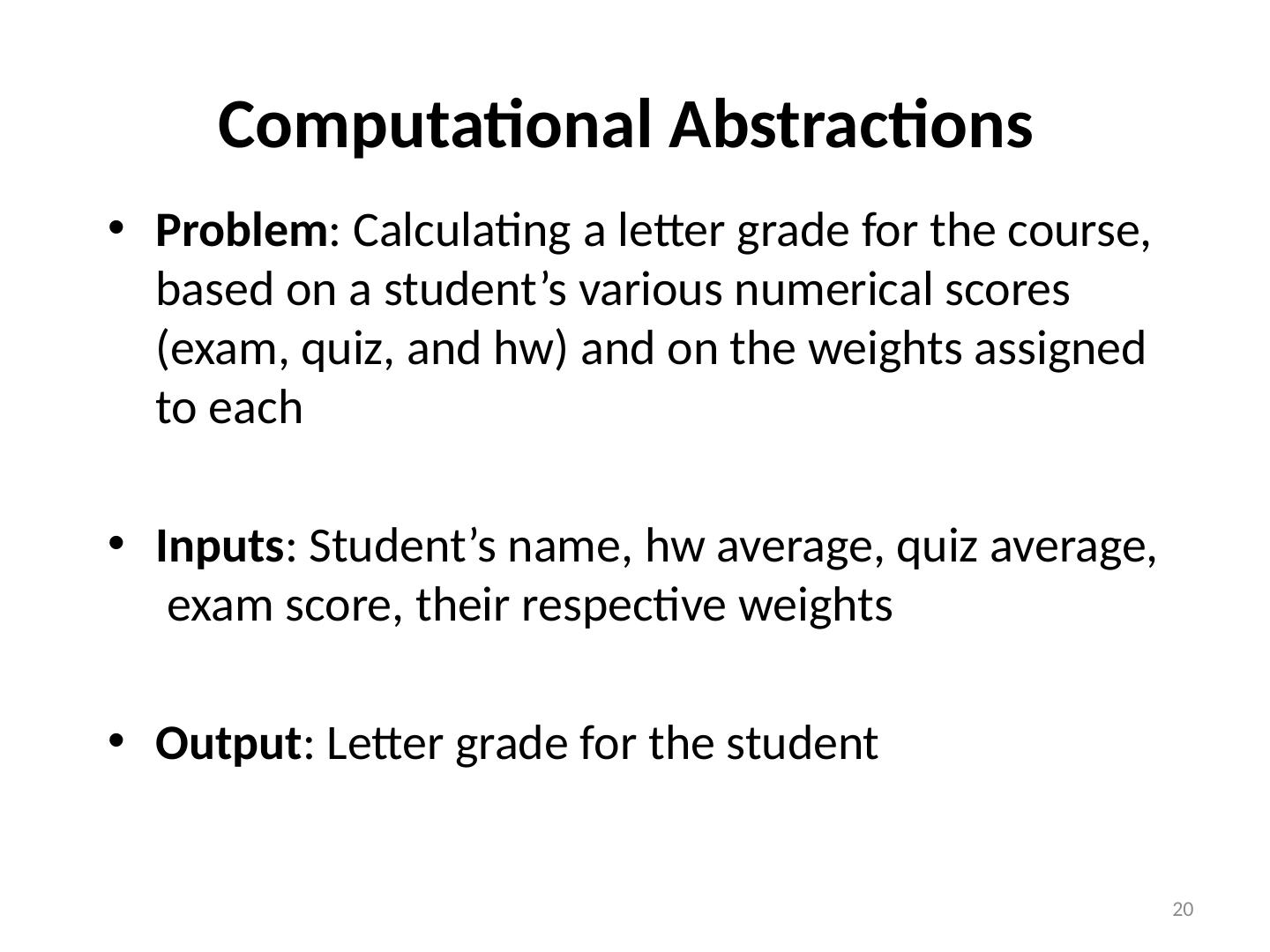 20 .20 Computational Abstractions Problem : Calculating a letter grade for the course, based on a student’s various numerical scores (exam, quiz, and hw) and on the weights assigned to each Inputs : Student’s name, hw average, quiz average, exam score, their respective weights Output : Letter grade for the student