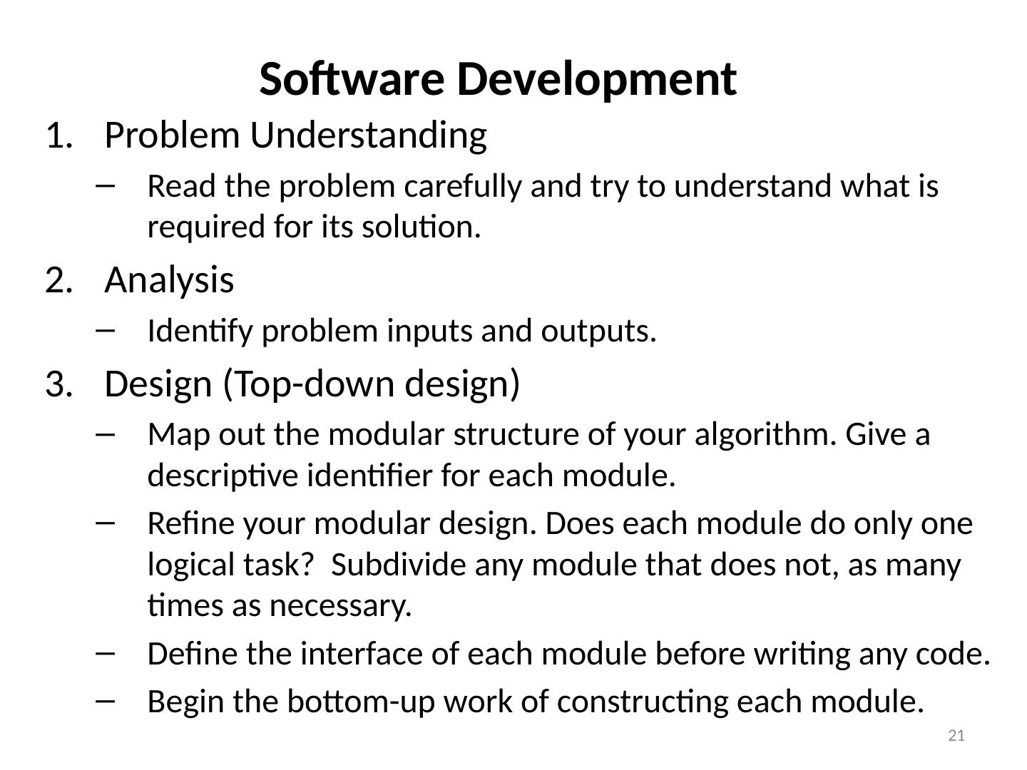 21 .21 Software Development Problem Understanding Read the problem carefully and try to understand what is required for its solution. Analysis Identify problem inputs and outputs. Design (Top-down design) Map out the modular structure of your algorithm. Give a descriptive identifier for each module. Refine your modular design. Does each module do only one logical task? Subdivide any module that does not, as many times as necessary. Define the interface of each module before writing any code. Begin the bottom-up work of constructing each module.