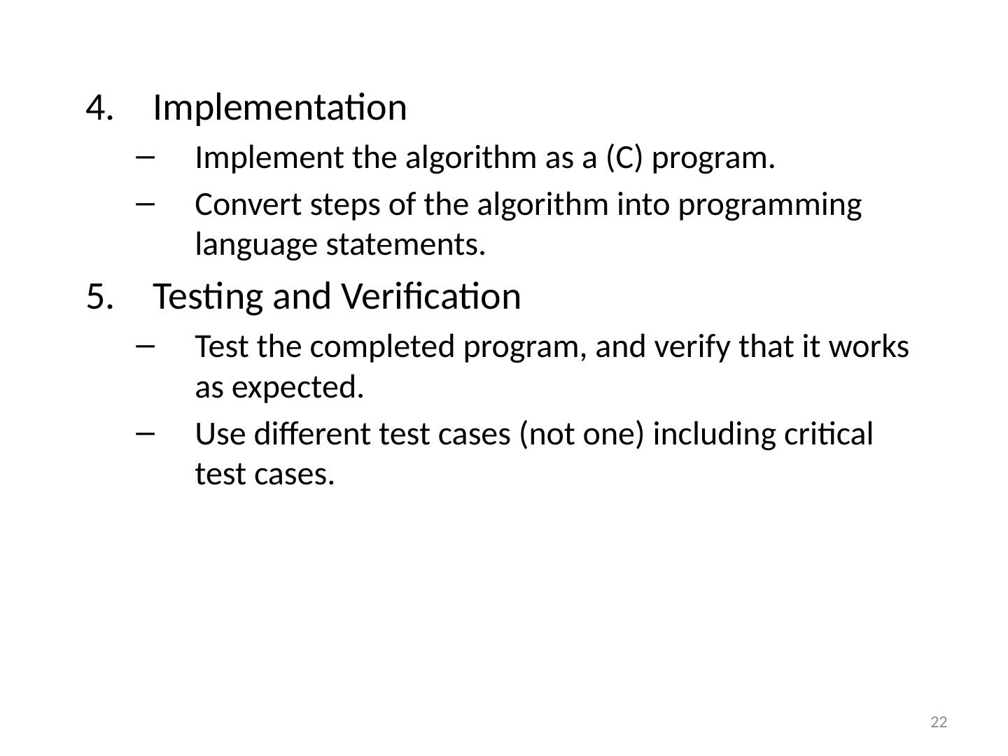 22 .22 Implementation Implement the algorithm as a (C) program. Convert steps of the algorithm into programming language statements. Testing and Verification Test the completed program, and verify that it works as expected. Use different test cases (not one) including critical test cases.