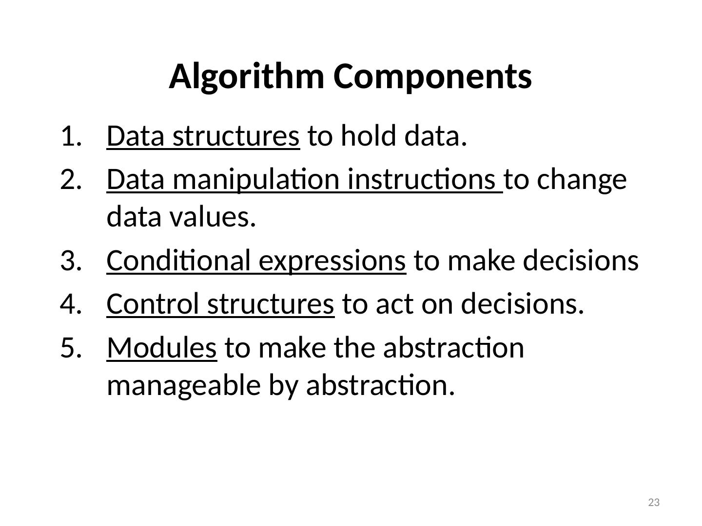 23 .23 Algorithm Components Data structures to hold data. Data manipulation instructions to change data values. Conditional expressions to make decisions Control structures to act on decisions. Modules to make the abstraction manageable by abstraction.
