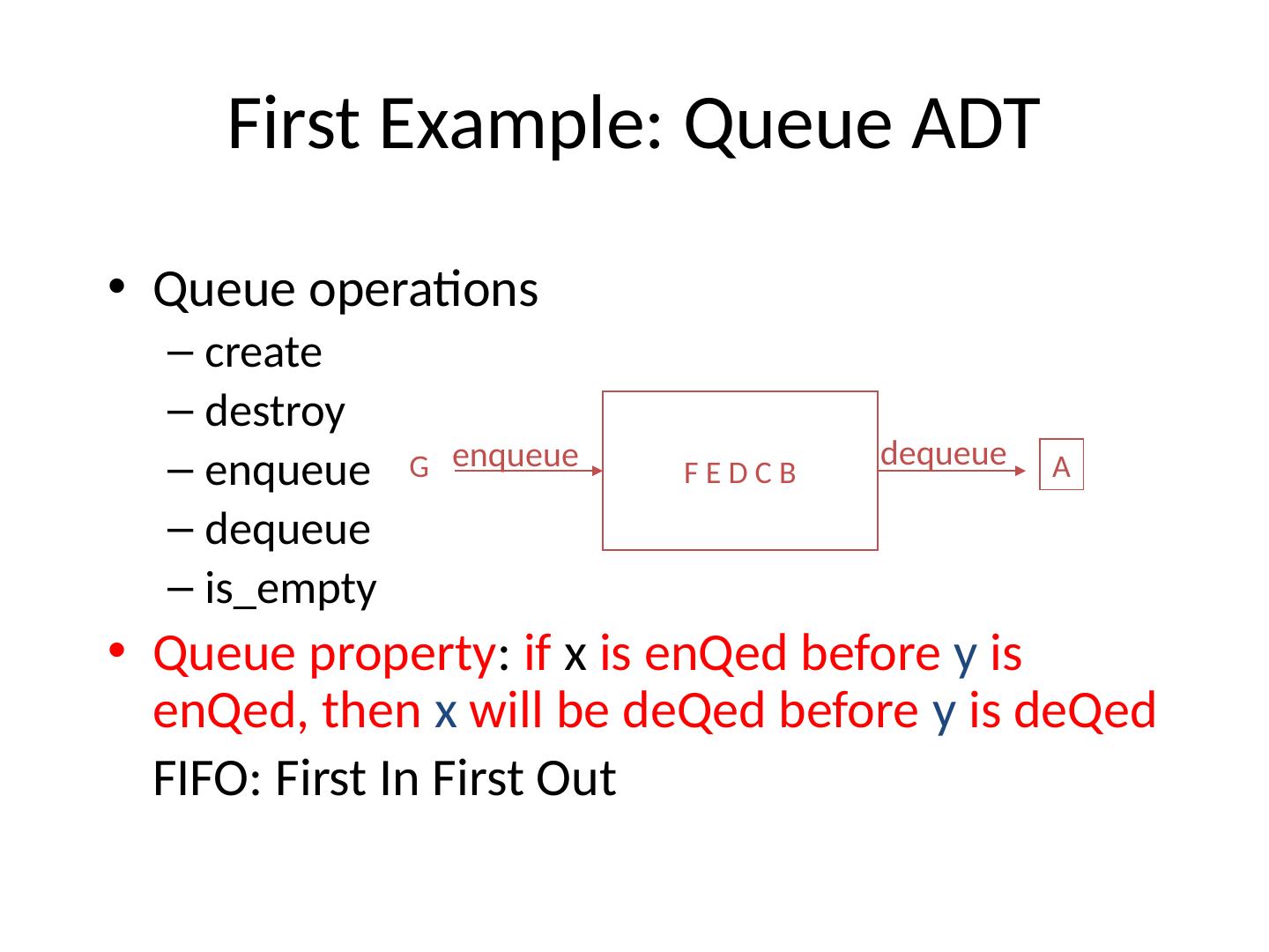 24 .Queue operations create destroy enqueue dequeue is_empty Queue property : if x is enQed before y is enQed, then x will be deQed before y is deQed FIFO: First In First Out First Example: Queue ADT F E D C B enqueue dequeue G A