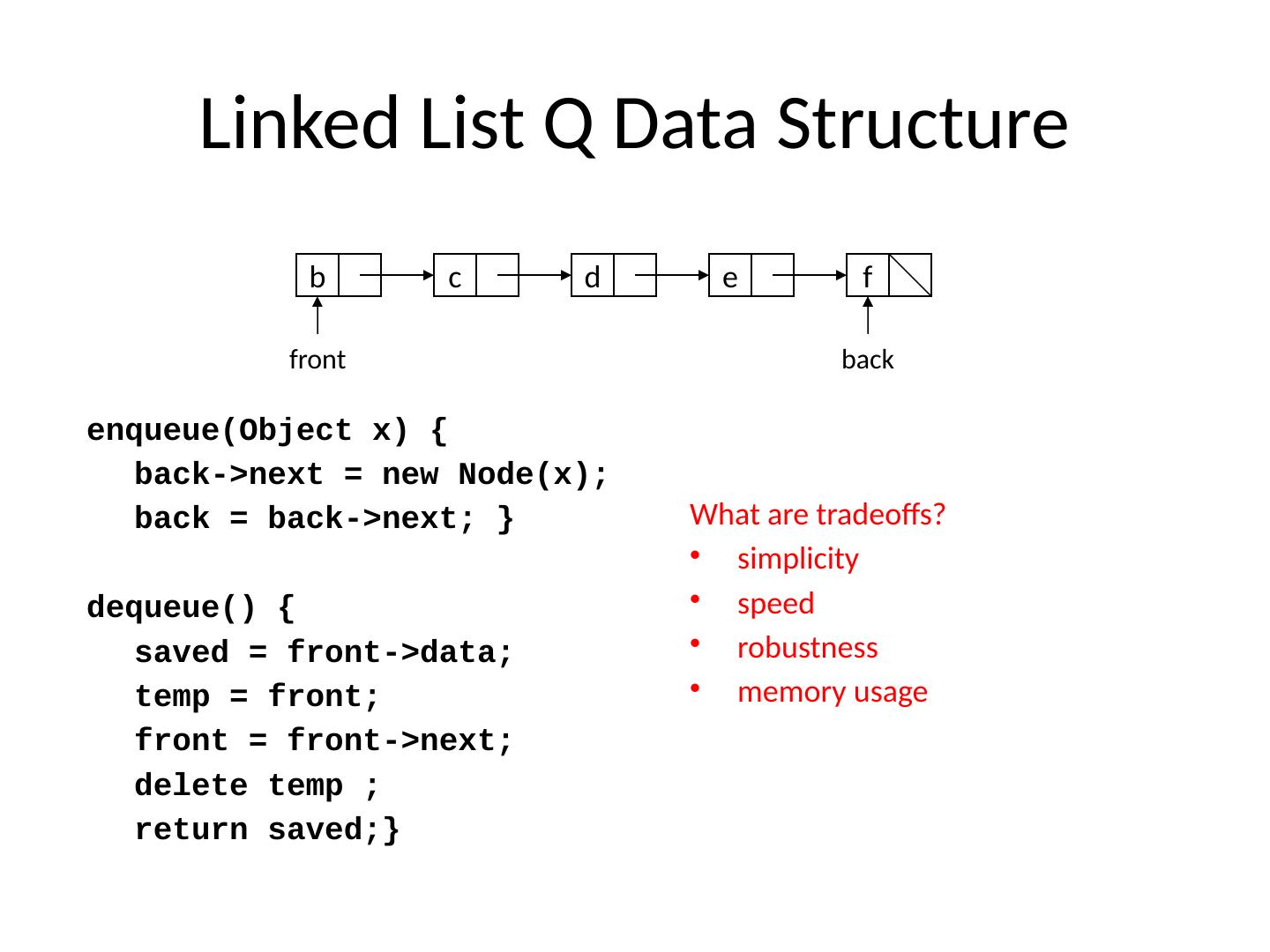26 .Linked List Q Data Structure b c d e f front back enqueue(Object x) { back->next = new Node(x); back = back->next; } dequeue() { saved = front->data; temp = front; front = front->next; delete temp ; return saved;} What are tradeoffs? simplicity speed robustness memory usage