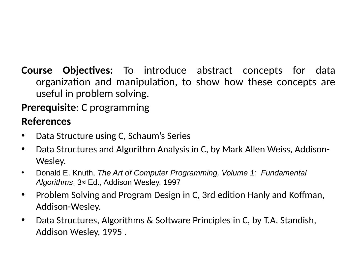27 .Course Objectives: To introduce abstract concepts for data organization and manipulation, to show how these concepts are useful in problem solving. Prerequisite : C programming References Data Structure using C, Schaum’s Series Data Structures and Algorithm Analysis in C, by Mark Allen Weiss, Addison-Wesley. Donald E. Knuth, The Art of Computer Programming, Volume 1: Fundamental Algorithms , 3 rd Ed., Addison Wesley, 1997 Problem Solving and Program Design in C, 3rd edition Hanly and Koffman , Addison-Wesley. Data Structures, Algorithms & Software Principles in C, by T.A. Standish, Addison Wesley, 1995 .